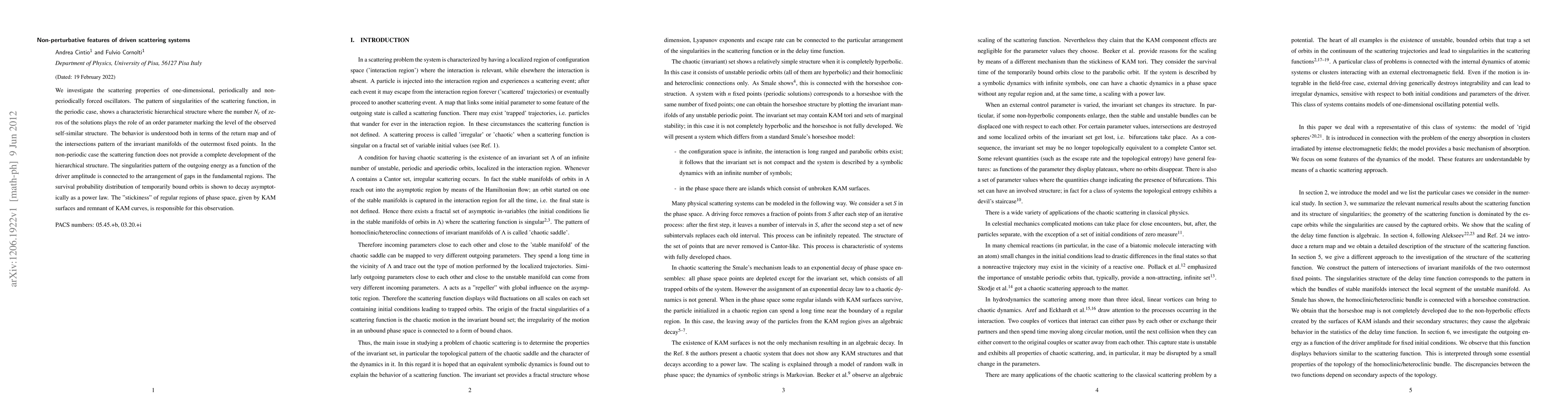 We investigate the scattering properties of one-dimensional, periodically and non-periodically forced oscillators. The pattern of singularities of the scattering function, in the periodic case, shows a characteristic hierarchical structure where the number Nc of zeros of the solutions plays the role of an order parameter marking the level of the observed self-similar structure. The behavior is understood both in terms of the return map and of the intersections pattern of the invariant manifolds of the outermost fixed points. In the non-periodic case the scattering function does not provide a complete development of the hierarchical structure. The singularities pattern of the outgoing energy as a function of the driver amplitude is connected to the arrangement of gaps in the fundamental regions. The survival probability distribution of temporarily bound orbits is shown to decay asymptotically as a power law. The "stickiness" of regular regions of phase space, given by KAM surfaces and remnant of KAM curves, is responsible for this observation.