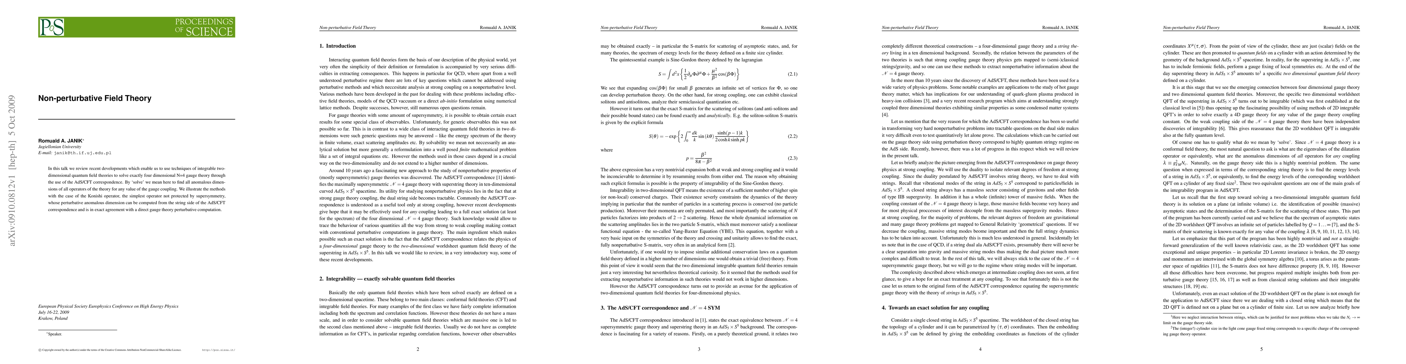In this talk we review recent developments which enable us to use techniques of integrable two-dimensional quantum field theories to solve exactly four dimensional N=4 gauge theory through the use of the AdS/CFT correspondence. By `solve' we mean here to find all anomalous dimensions of all operators of the theory for any value of the gauge coupling. We illustrate the methods with the case of the Konishi operator, the simplest operator not protected by supersymmetry, whose perturbative anomalous dimension can be computed from the string side of the AdS/CFT correspondence and is in exact agreement with a direct gauge theory perturbative computation.