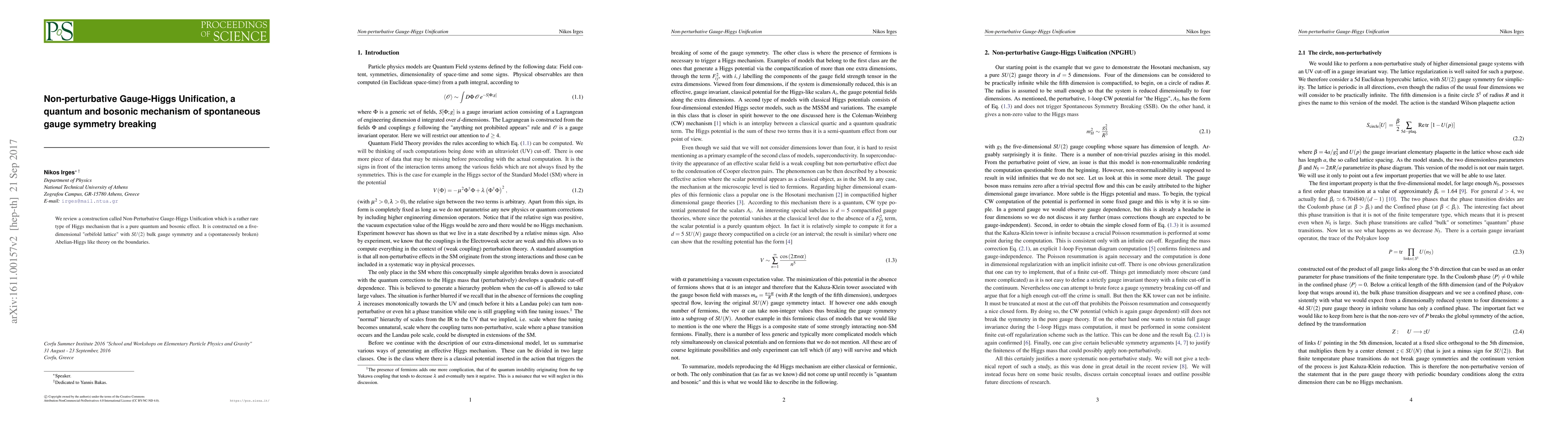 This paper reviews Non-Perturbative Gauge-Higgs Unification, a unique quantum and bosonic mechanism for spontaneous gauge symmetry breaking, realized through a five-dimensional orbifold lattice with SU(2) bulk gauge symmetry and a boundary Abelian-Higgs theory.