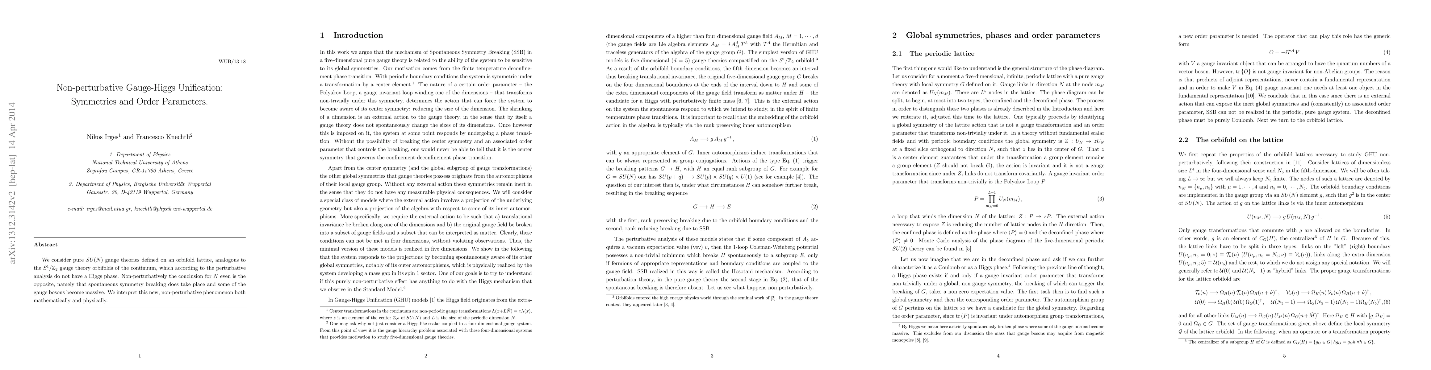 We consider pure SU(N) gauge theories defined on an orbifold lattice, analogous to the S^1/Z_2 gauge theory orbifolds of the continuum, which according to the perturbative analysis do not have a Higgs phase. Non-perturbatively the conclusion for N even is the opposite, namely that spontaneous symmetry breaking does take place and some of the gauge bosons become massive. We interpret this new, non-perturbative phenomenon both mathematically and physically.