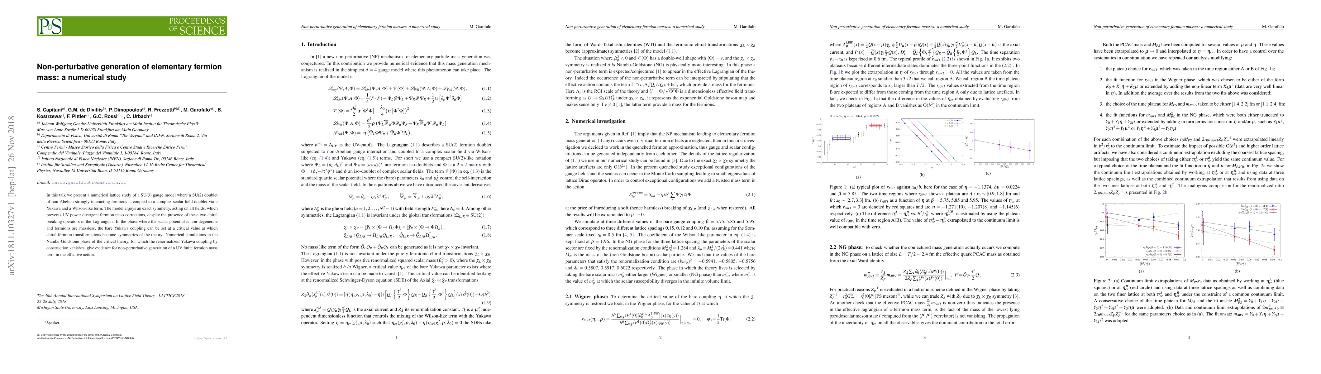 In this talk we present a numerical lattice study of an SU(3) gauge model where an SU(2) doublet of non-Abelian strongly interacting fermions is coupled to a complex scalar field doublet via a Yukawa and a Wilson-like term. The model enjoys an exact symmetry, acting on all fields, which prevents UV power divergent fermion mass corrections, despite the presence of these two chiral breaking operators in the Lagrangian. In the phase where the scalar potential is non-degenerate and fermions are massless, the bare Yukawa coupling can be set at a critical value at which chiral fermion transformations become symmetries of the theory. Numerical simulations in the Nambu-Goldstone phase of the critical theory, for which the renormalized Yukawa coupling by construction vanishes, give evidence for non-perturbative generation of a UV finite fermion mass term in the effective action.