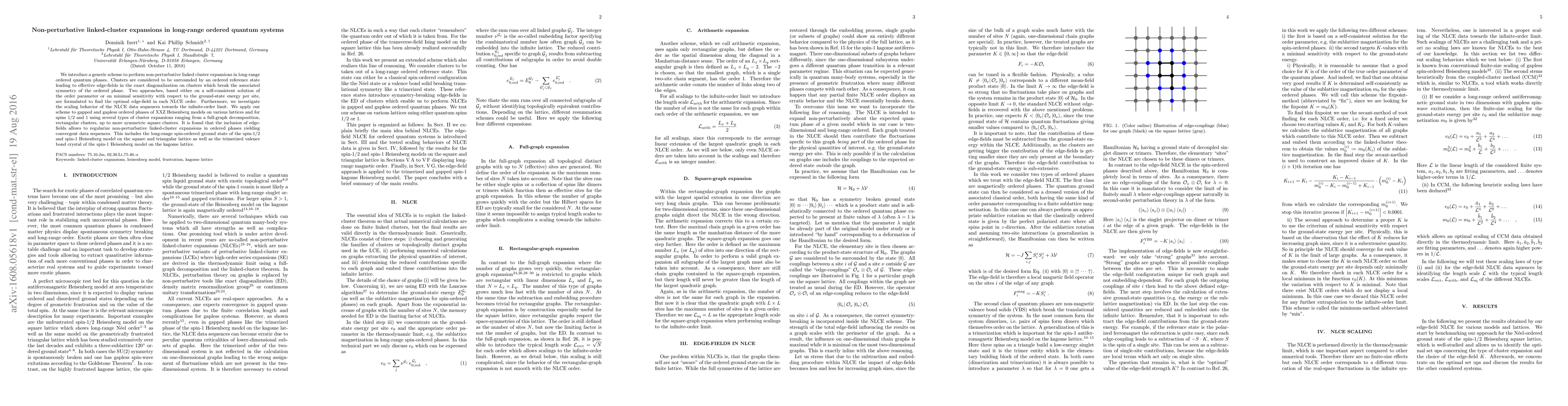 This paper presents a non-perturbative linked-cluster expansion method for long-range ordered quantum systems, introducing edge-fields to break the symmetry and achieve regularization. The method is applied to various XXZ Heisenberg models, showing convergent data sequences in both gapped and gapless phases.