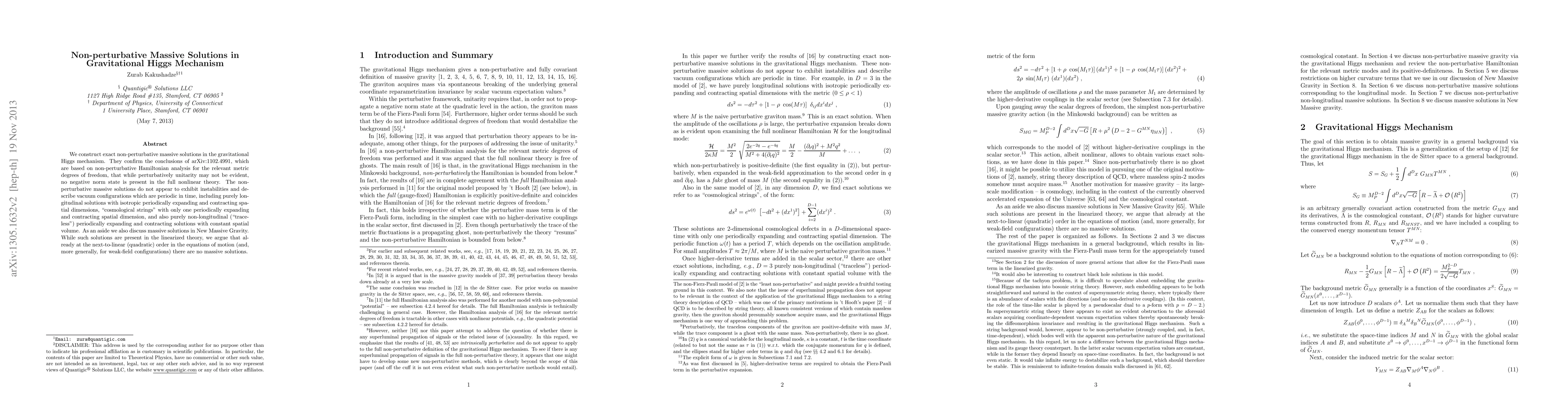 We construct exact non-perturbative massive solutions in the gravitational Higgs mechanism. They confirm the conclusions of arXiv:1102.4991, which are based on non-perturbative Hamiltonian analysis for the relevant metric degrees of freedom, that while perturbatively unitarity may not be evident, no negative norm state is present in the full nonlinear theory. The non-perturbative massive solutions do not appear to exhibit instabilities and describe vacuum configurations which are periodic in time, including purely longitudinal solutions with isotropic periodically expanding and contracting spatial dimensions, "cosmological strings" with only one periodically expanding and contracting spatial dimension, and also purely non-longitudinal ("traceless") periodically expanding and contracting solutions with constant spatial volume. As an aside we also discuss massive solutions in New Massive Gravity. While such solutions are present in the linearized theory, we argue that already at the next-to-linear (quadratic) order in the equations of motion (and, more generally, for weak-field configurations) there are no massive solutions.