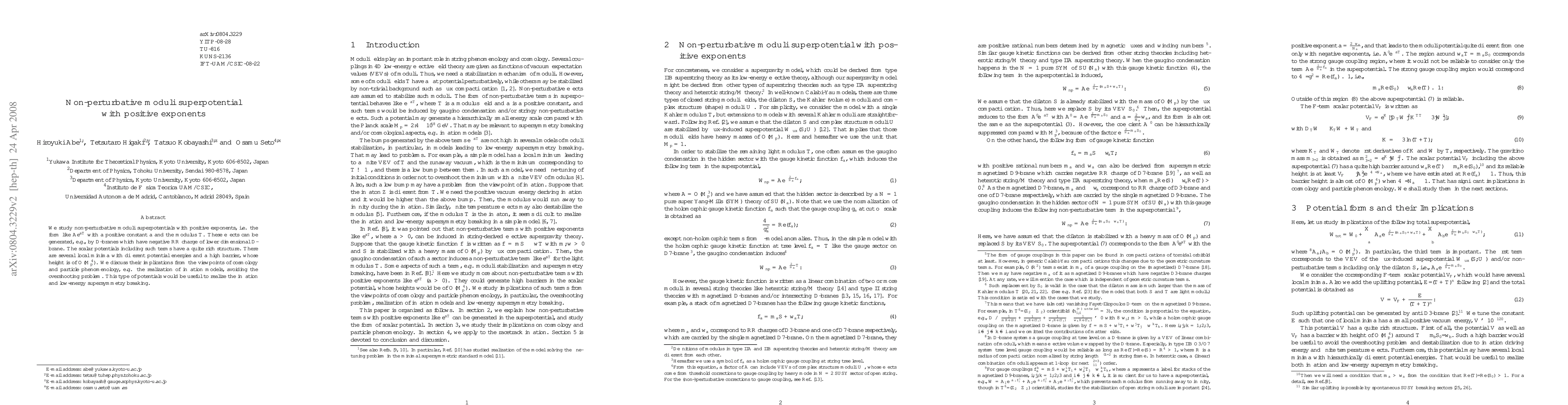 We study non-perturbative moduli superpotentials with positive exponents, i.e. the form like $Ae^{aT}$ with a positive constant $a$ and the modulus $T$. These effects can be generated, e.g., by D-branes which have negative RR charge of lower dimensional D-brane. The scalar potentials including such terms have a quite rich structure. There are several local minima with different potential energies and a high barrier, whose height is of ${\cal O}(M_p^4)$. We discuss their implications from the viewpoints of cosmology and particle phenomenology, e.g. the realization of inflation models, avoiding the overshooting problem. This type of potentials would be useful to realize the inflation and low-energy supersymmetry breaking.
