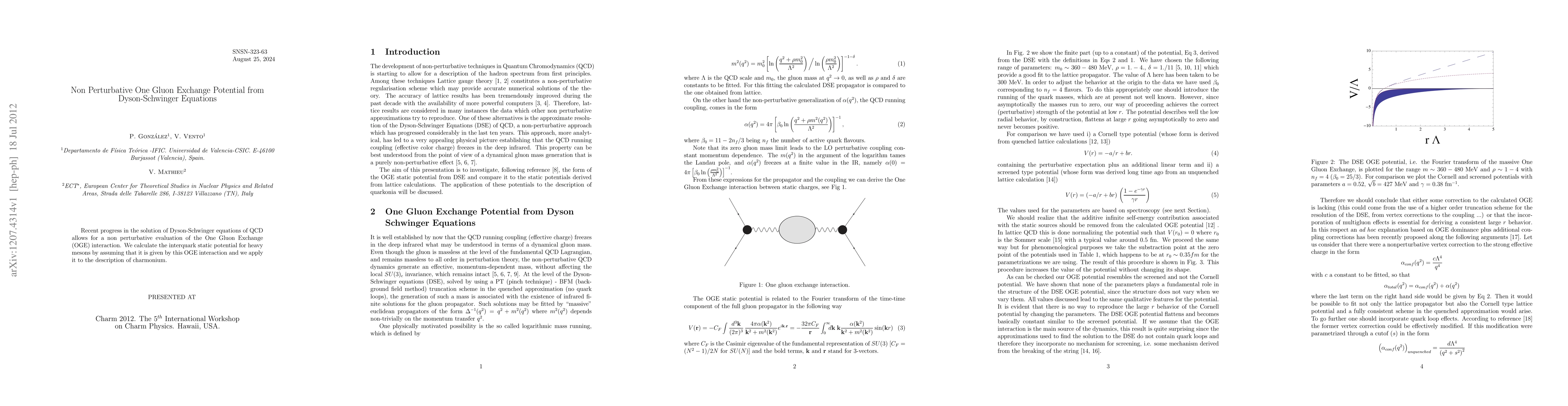 Recent progress in the solution of Dyson-Schwinger equations of QCD allows for a non perturbative evaluation of the One Gluon Exchange (OGE) interaction. We calculate the interquark static potential for heavy mesons by assuming that it is given by this OGE interaction and we apply it to the description of charmonium.