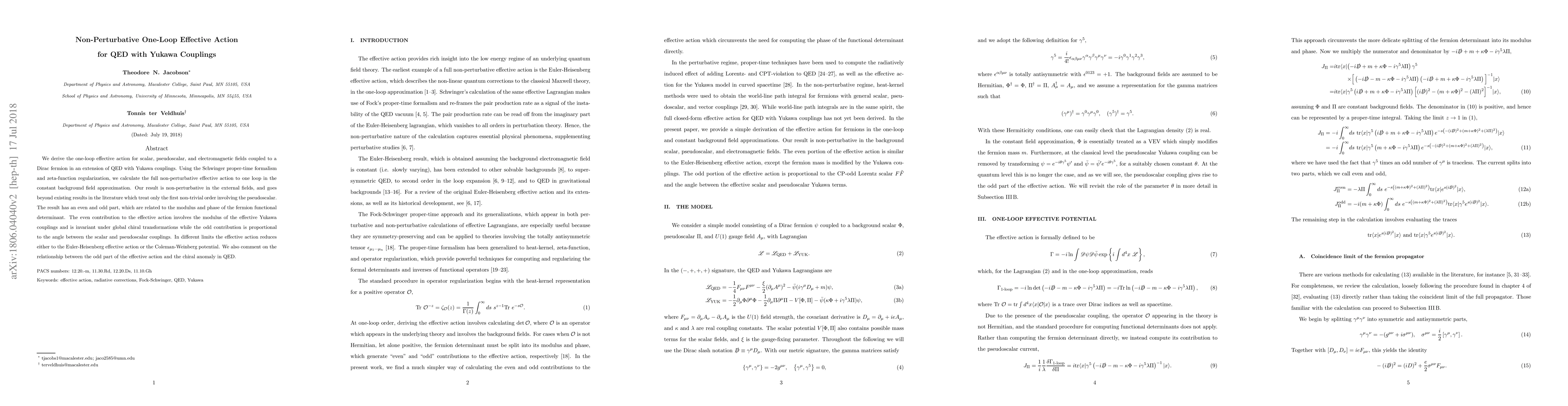 This paper derives the non-perturbative one-loop effective action for QED extended with Yukawa couplings, revealing contributions from both even and odd parts related to the modulus and phase of the fermion determinant. The result extends beyond first-order effects and connects to the Euler-Heisenberg action and Coleman-Weinberg potential in specific limits.