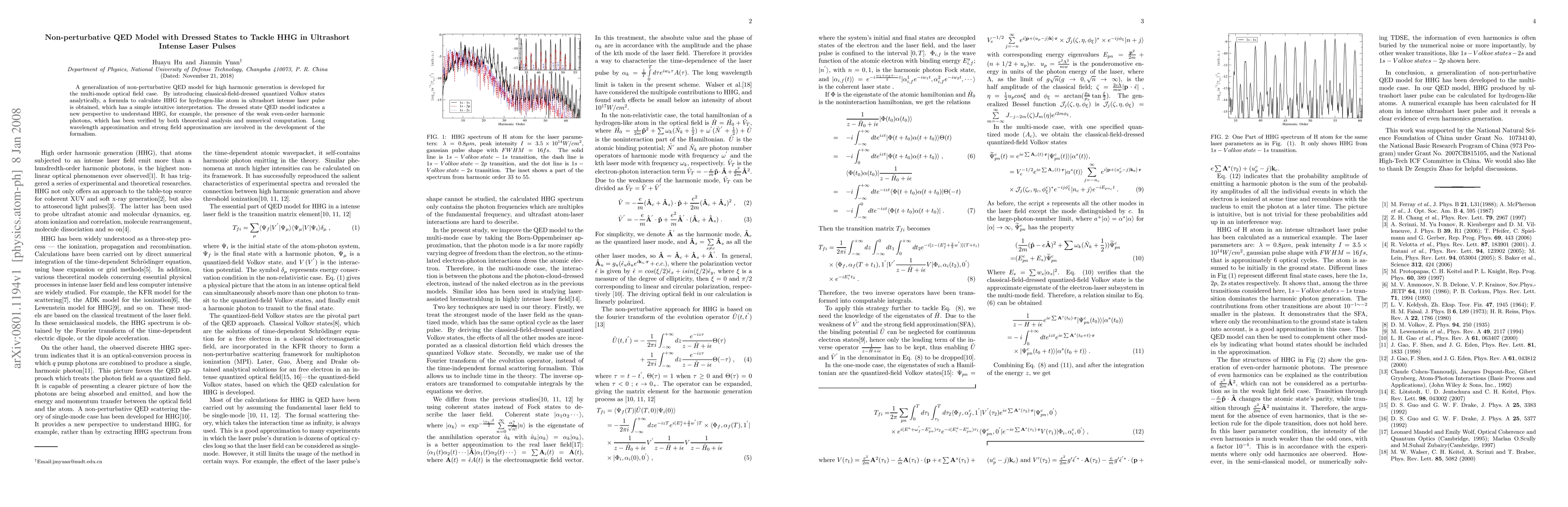 This paper develops a non-perturbative QED model for high harmonic generation (HHG) in ultrashort intense laser pulses using dressed quantized Volkov states. The model reveals the presence of weak even-order harmonic photons, verified by theoretical and numerical analysis, offering a new perspective on the underlying physics of HHG.