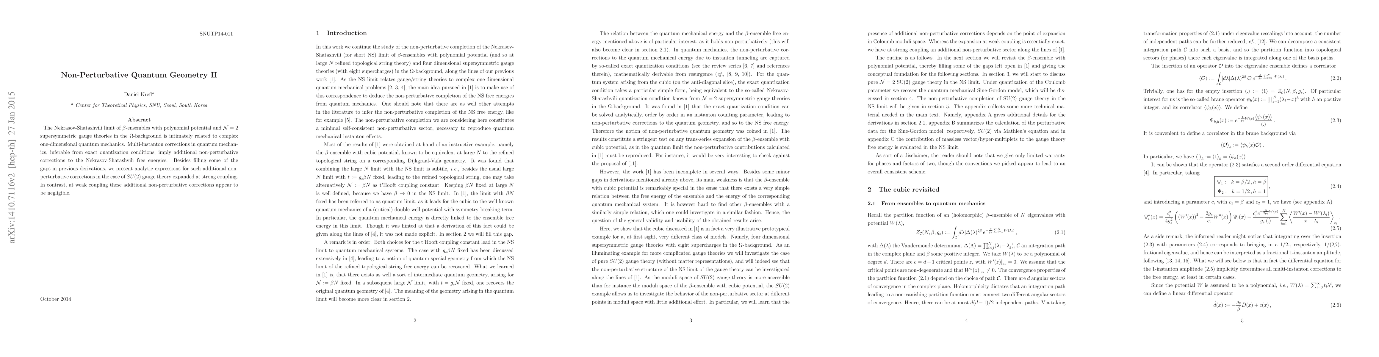 The Nekrasov-Shatashvili limit of beta-ensembles with polynomial potential and N=2 supersymmetric gauge theories in the Omega-background is intimately related to complex one-dimensional quantum mechanics. Multi-instanton corrections in quantum mechanics, inferable from exact quantization conditions, imply additional non-perturbative corrections to the Nekrasov-Shatashvili free energies. Besides filling some of the gaps in previous derivations, we present analytic expressions for such additional non-perturbative corrections in the case of SU(2) gauge theory expanded at strong coupling. In contrast, at weak coupling these additional non-perturbative corrections appear to be negligible.