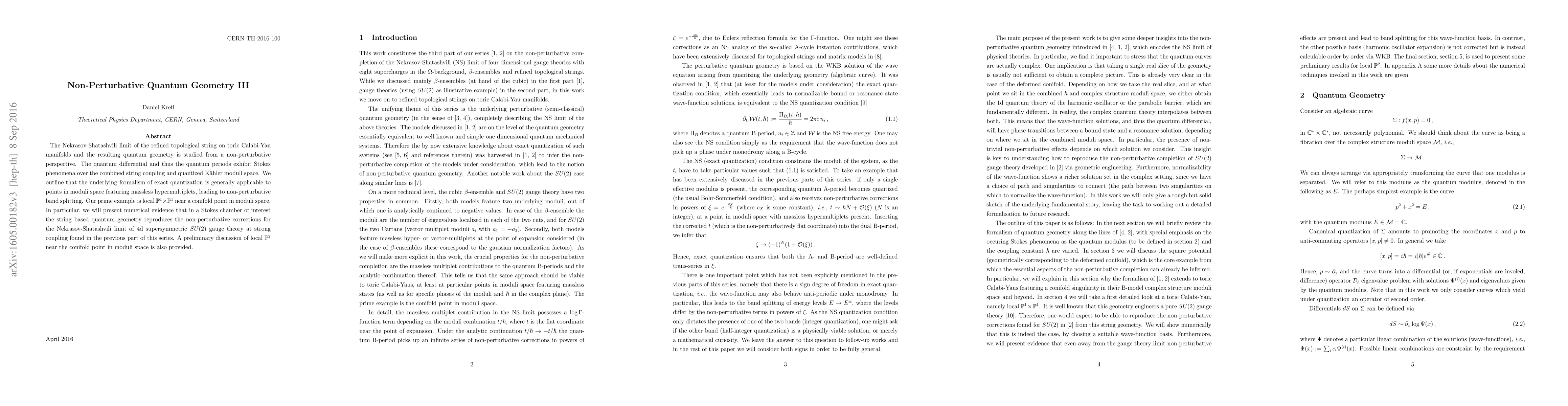 The Nekrasov-Shatashvili limit of the refined topological string on toric Calabi-Yau manifolds and the resulting quantum geometry is studied from a non-perturbative perspective. The quantum differential and thus the quantum periods exhibit Stokes phenomena over the combined string coupling and quantized Kaehler moduli space. We outline that the underlying formalism of exact quantization is generally applicable to points in moduli space featuring massless hypermultiplets, leading to non-perturbative band splitting. Our prime example is local P1xP1 near a conifold point in moduli space. In particular, we will present numerical evidence that in a Stokes chamber of interest the string based quantum geometry reproduces the non-perturbative corrections for the Nekrasov-Shatashvili limit of 4d supersymmetric SU(2) gauge theory at strong coupling found in the previous part of this series. A preliminary discussion of local P2 near the conifold point in moduli space is also provided.