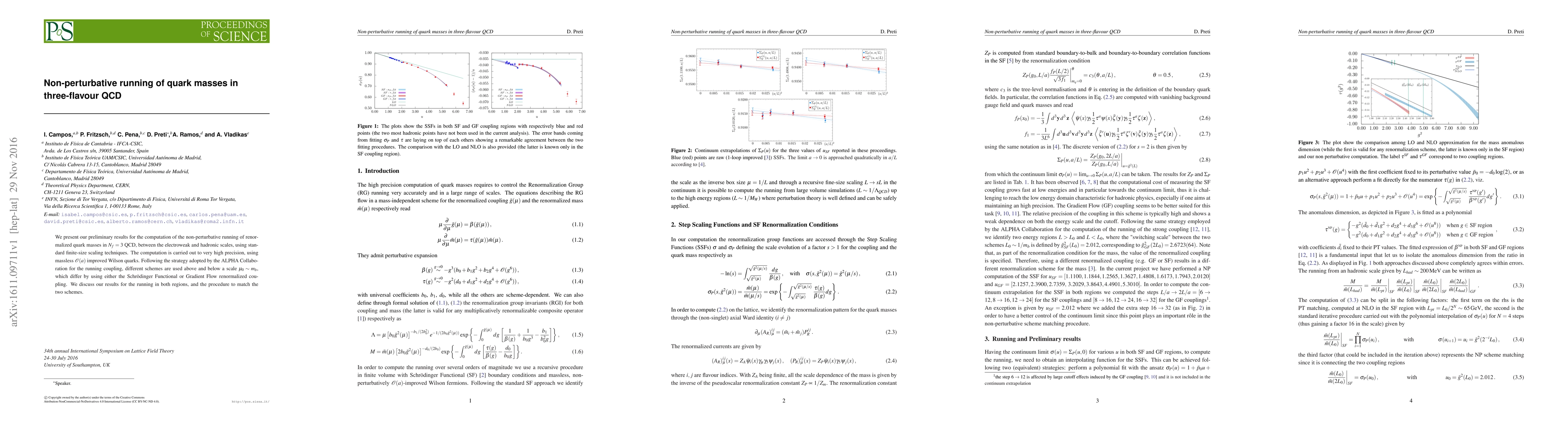 We present our preliminary results for the computation of the non-perturbative running of renormalized quark masses in $N_f = 3$ QCD, between the electroweak and hadronic scales, using standard finite-size scaling techniques. The computation is carried out to very high precision, using massless $\mathcal{O}(a)$-improved Wilson quarks. Following the strategy adopted by the ALPHA Collaboration for the running coupling, different schemes are used above and below a scale $\mu_0 \sim m_b$, which differ by using either the Schr\"odinger Functional or Gradient Flow renormalized coupling. We discuss our results for the running in both regions, and the procedure to match the two schemes.