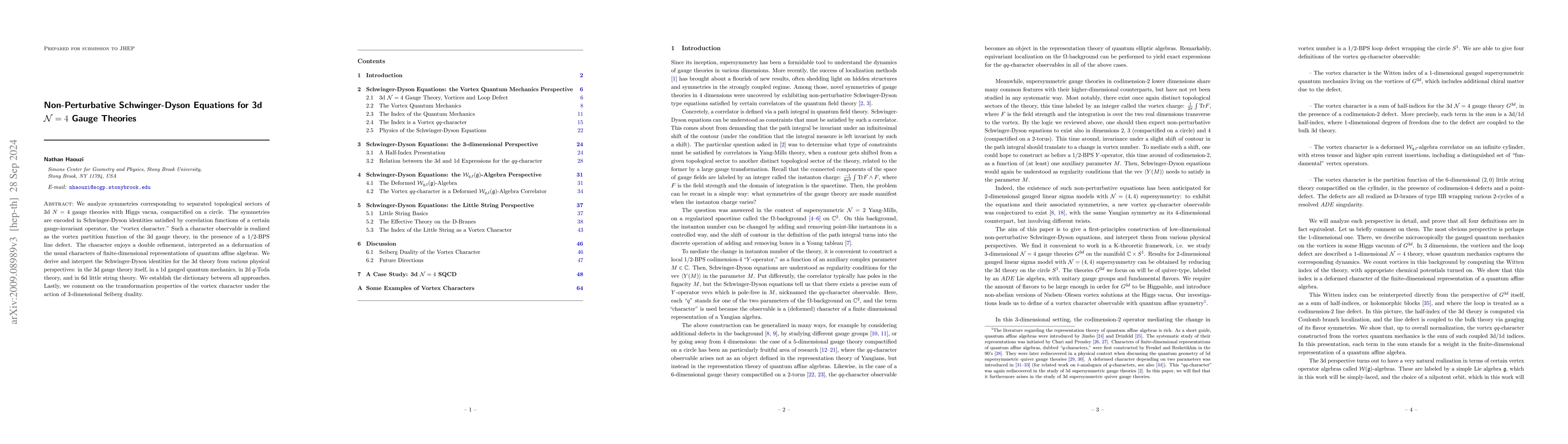 This paper analyzes symmetries in 3d ${\cal N} = 4$ gauge theories through Schwinger-Dyson equations, focusing on topological sectors with Higgs vacua and 1/2-BPS line defects. It establishes connections between the vortex character in various physical frameworks, including 3d gauge theory, 1d gauged quantum mechanics, 2d $q$-Toda theory, and 6d little string theory, and discusses the transformation properties under three-dimensional Seiberg duality.