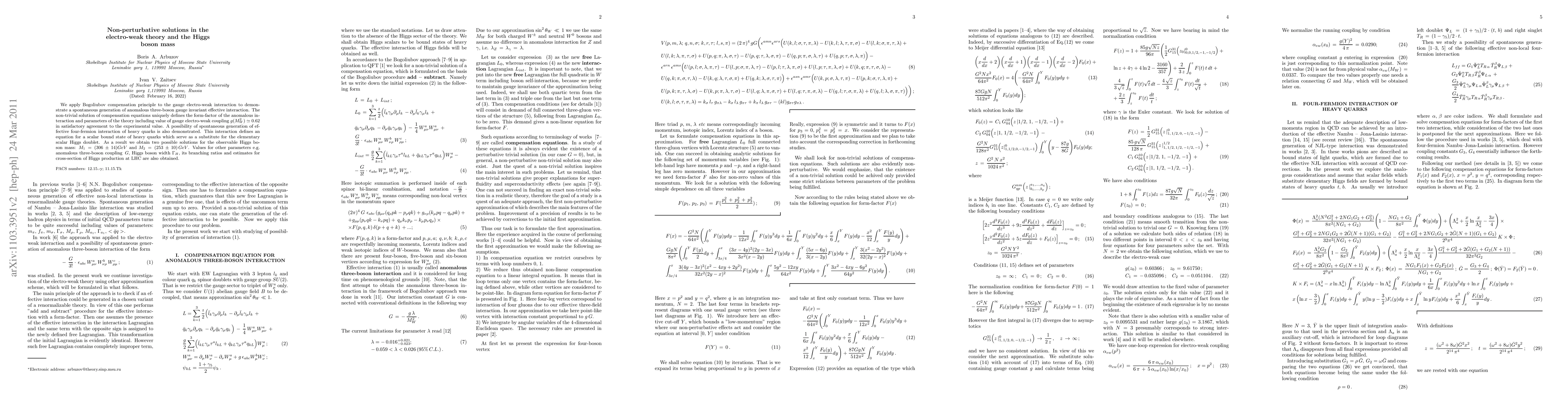 We apply Bogoliubov compensation principle to the gauge electro-weak interaction to demonstrate a spontaneous generation of anomalous three-boson gauge invariant effective interaction. The non-trivial solution of compensation equations uniquely defines the form-factor of the anomalous interaction and parameters of the theory including value of gauge electro-weak coupling $g(M_W^2)\simeq 0.62$ in satisfactory agreement to the experimental value. A possibility of spontaneous generation of effective four-fermion interaction of heavy quarks is also demonstrated. This interaction defines an equation for a scalar bound state of heavy quarks which serve as a substitute for the elementary scalar Higgs doublet. As a result we obtain two possible solutions for the observable Higgs boson mass: $M_1\,=\,(306\,\pm\,14)GeV$ and $M_2\,=\,(253\,\pm\,10)\,GeV$. Values for other parameters e.g. anomalous three-boson coupling $\,G$, Higgs boson width $\Gamma_H$, its branching ratios and estimates for cross-section of Higgs production at LHC are also obtained.
