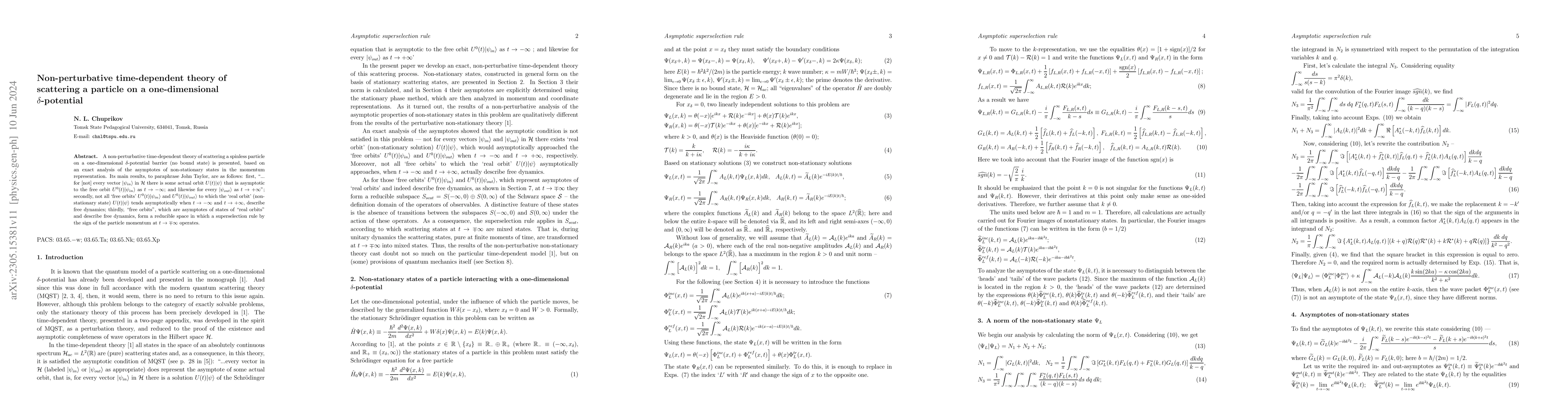 A non-perturbative time-dependent theory of scattering a spinless particle on a one-dimensional $\delta$-potential barrier (no bound state) is presented, based on an exact analysis of the asymptotes of non-stationary states in the momentum representation. Its main results, to paraphrase John Taylor, are as follows: first, ``... for [not] every vector $|\psi_{in}\rangle$ in $\mathcal{H}$ there is some actual orbit $U(t)|\psi\rangle$ that is asymptotic to the free orbit $U^0(t)|\psi_{in}\rangle$ as $t\to -\infty$; and likewise for every $|\psi_{out}\rangle$ as $t\to +\infty$''; secondly, not all `free orbits' $U^0(t)|\psi_{in}\rangle$ and $U^0(t)|\psi_{out}\rangle$ to which the `real orbit' (non-stationary state) $U(t)|\psi\rangle$ tends asymptotically when $t\to -\infty$ and $t\to +\infty$, describe free dynamics; thirdly, `free orbits', which are asymptotes of states of `real orbits' and describe free dynamics, form a reducible space in which a superselection rule by the sign of the particle momentum at $t\to\mp\infty$ operates.
