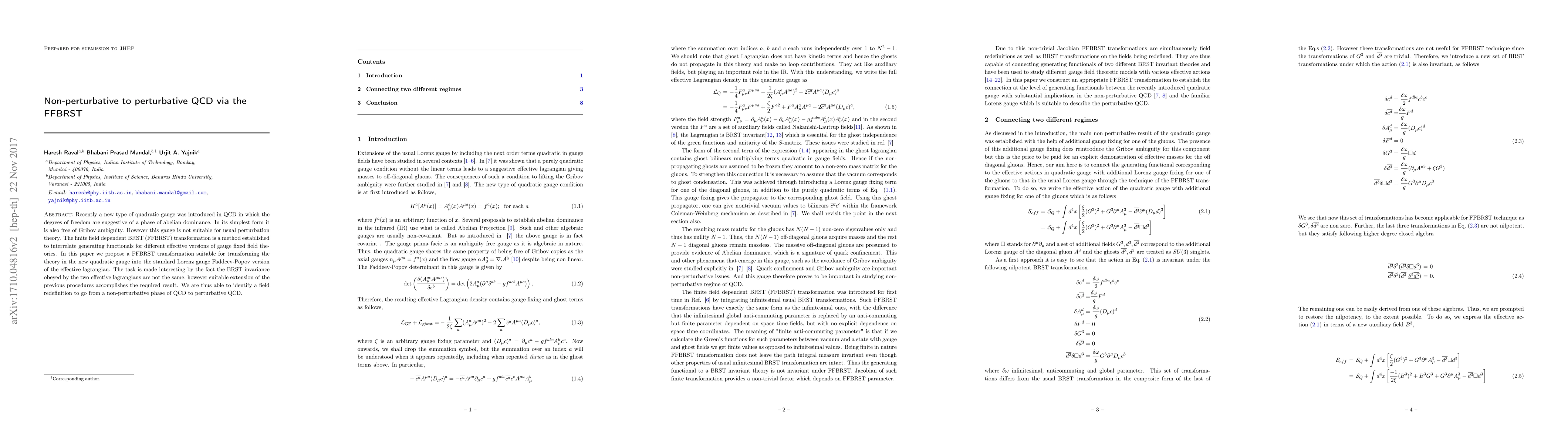 Recently a new type of quadratic gauge was introduced in QCD in which the degrees of freedom are suggestive of a phase of abelian dominance. In its simplest form it is also free of Gribov ambiguity. However this gauge is not suitable for usual perturbation theory. The finite field dependent BRST (FFBRST) transformation is a method established to interrelate generating functionals for different effective versions of gauge fixed field theories. In this paper we propose a FFBRST transformation suitable for transforming the theory in the new quadratic gauge into the standard Lorenz gauge Faddeev-Popov version of the effective lagrangian. The task is made interesting by the fact the BRST invariance obeyed by the two effective lagrangians are not the same, however suitable extension of the previous procedures accomplishes the required result. We are thus able to identify a field redefinition to go from a non-perturbative phase of QCD to perturbative QCD.