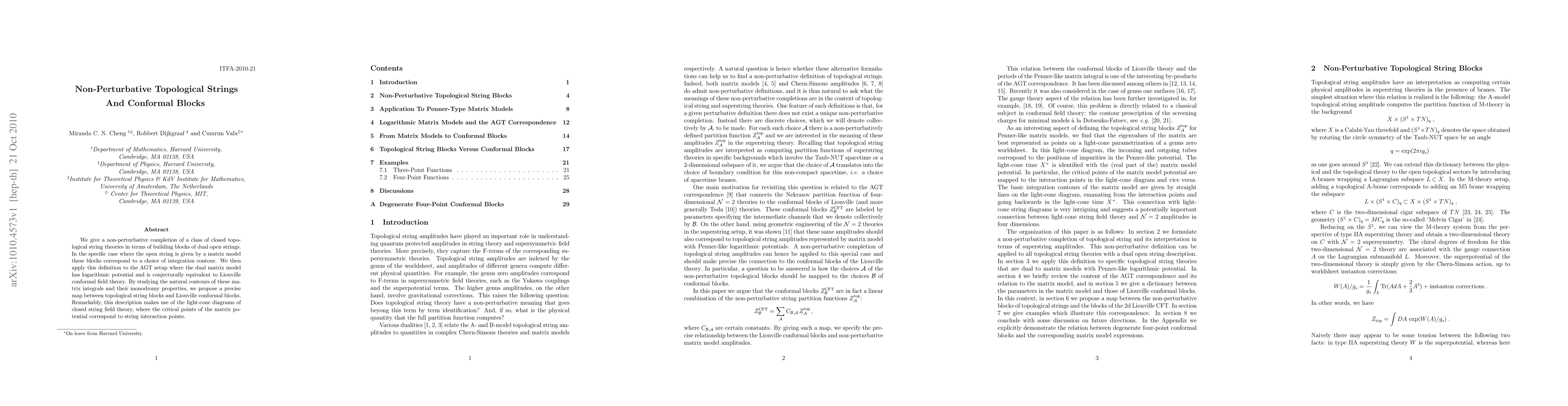 The research provides a non-perturbative completion of closed topological string theories using dual open strings, specifically focusing on matrix models. It applies this to the AGT setup, mapping topological string blocks to Liouville conformal blocks through the study of natural contours and monodromy properties.