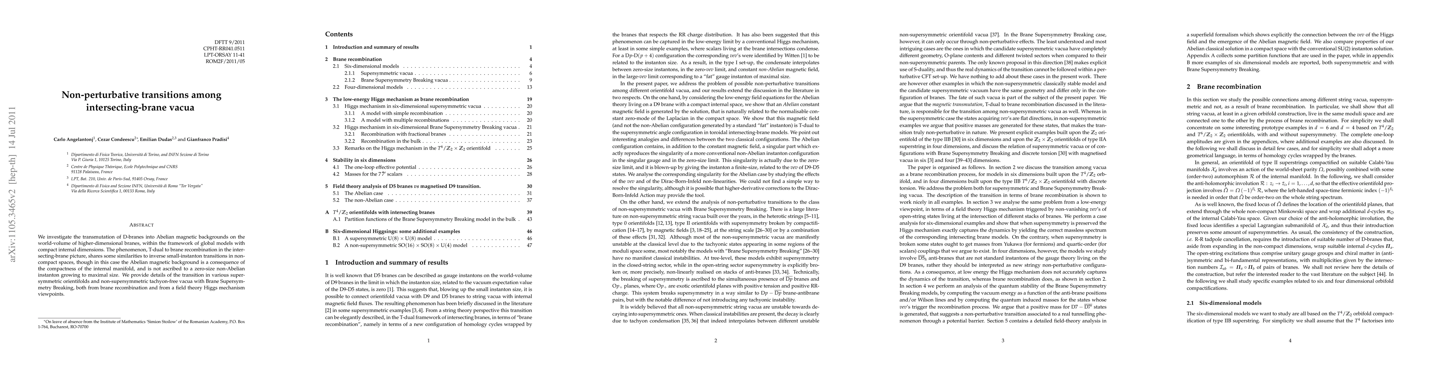 We investigate the transmutation of D-branes into Abelian magnetic backgrounds on the world-volume of higher-dimensional branes, within the framework of global models with compact internal dimensions. The phenomenon, T-dual to brane recombination in the intersecting-brane picture, shares some similarities to inverse small-instanton transitions in non-compact spaces, though in this case the Abelian magnetic background is a consequence of the compactness of the internal manifold, and is not ascribed to a zero-size non-Abelian instanton growing to maximal size. We provide details of the transition in various supersymmetric orientifolds and non-supersymmetric tachyon-free vacua with Brane Supersymmetry Breaking, both from brane recombination and from a field theory Higgs mechanism viewpoints.