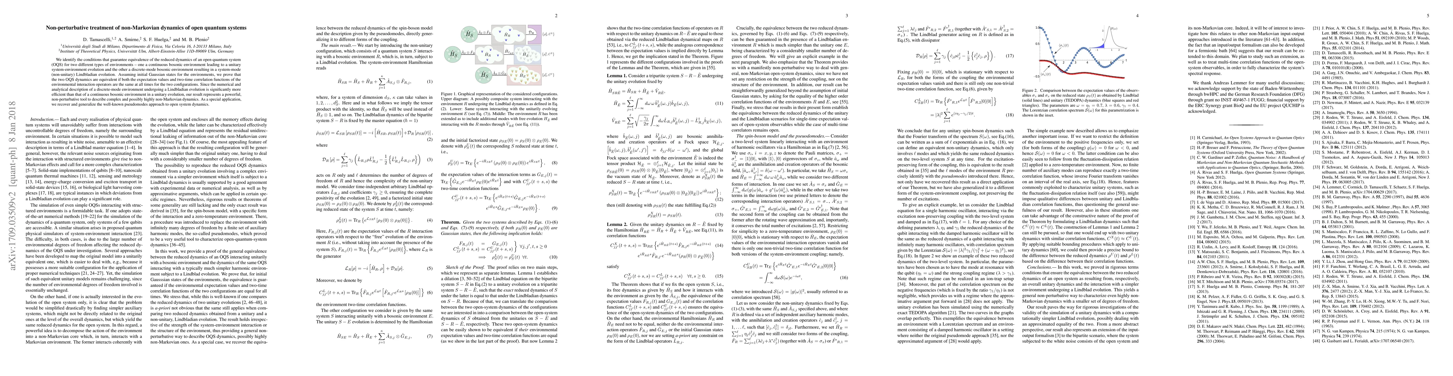 This paper establishes conditions for the equivalence of reduced dynamics in open quantum systems interacting with different environments, proving that unitary evolution in a continuous bosonic environment can be non-perturbatively treated equivalently to non-unitary Lindbladian evolution in a discrete-mode environment if certain correlation functions match. This provides a powerful tool for describing complex, non-Markovian dynamics.