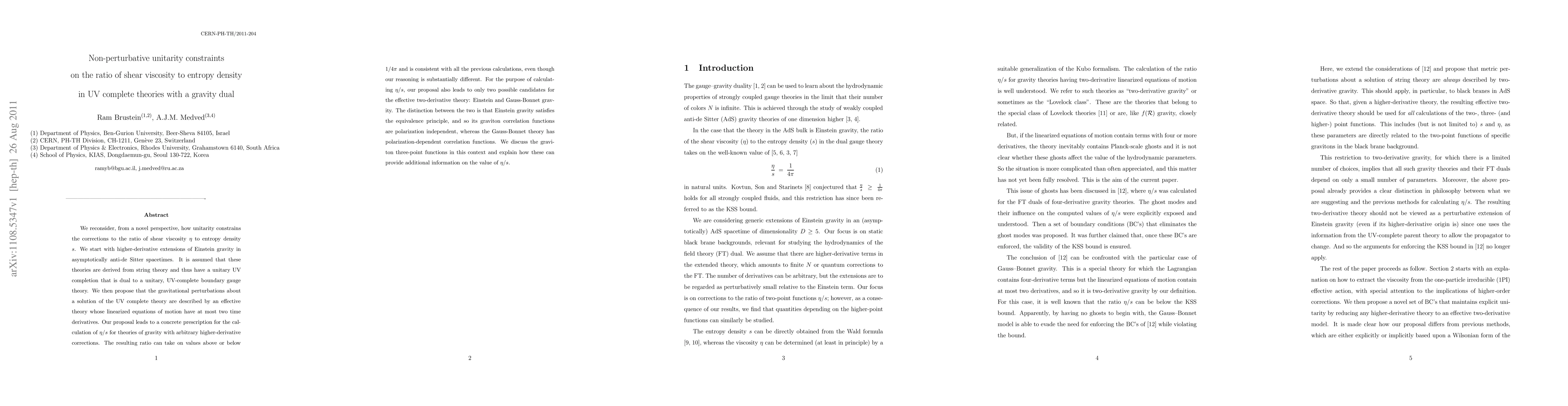 This paper explores how unitarity imposes non-perturbative constraints on the ratio of shear viscosity to entropy density in higher-derivative gravity theories with a gravity dual. It proposes an effective theory with two-derivative terms to calculate this ratio, finding that Einstein and Gauss-Bonnet gravity are the only viable candidates, with distinct implications for graviton correlation functions.