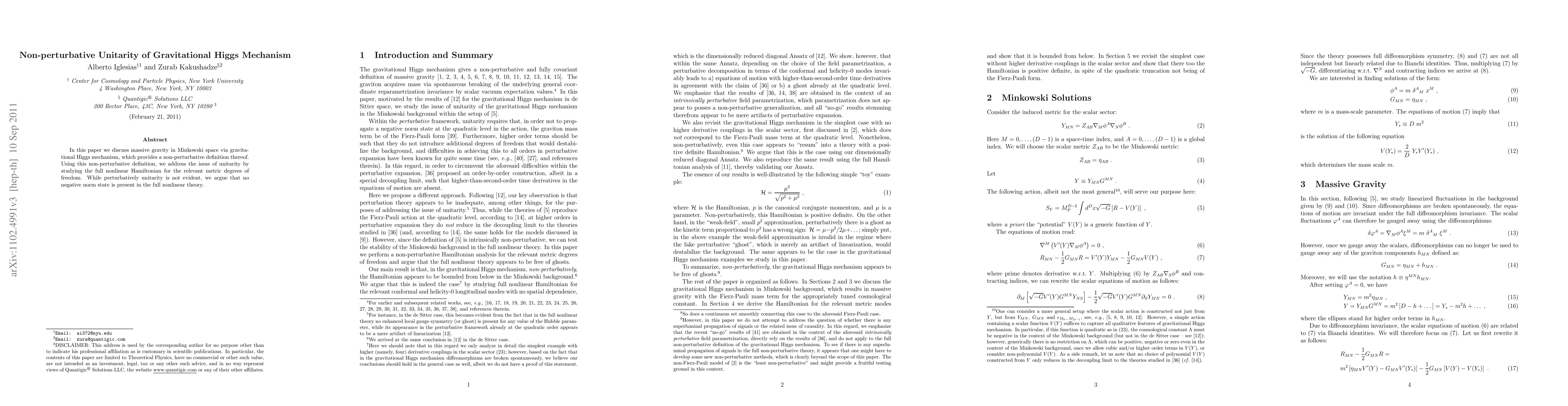This paper explores massive gravity in Minkowski space through the gravitational Higgs mechanism, providing a non-perturbative definition. It argues that despite perturbative unitarity issues, the full nonlinear theory contains no negative norm states, maintaining unitarity.