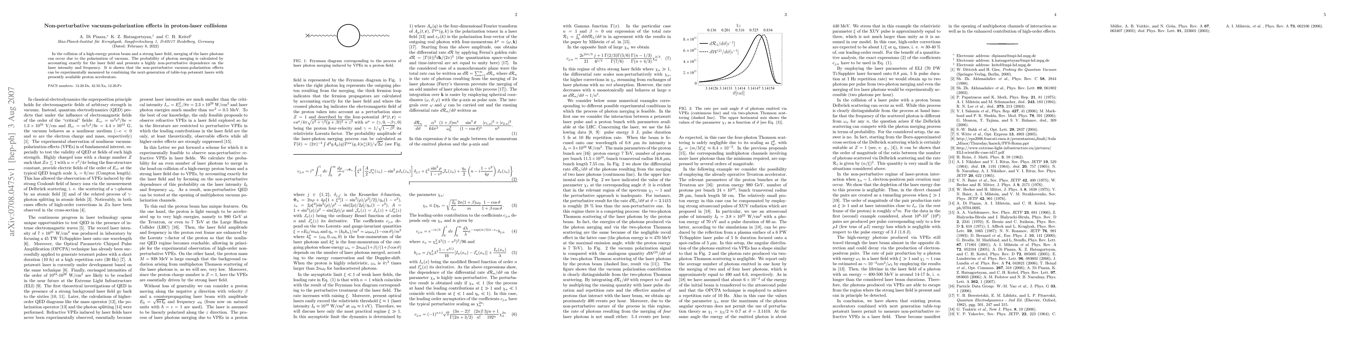 This paper investigates non-perturbative vacuum-polarization effects in proton-laser collisions, demonstrating that high-energy proton beams can interact with strong laser fields, leading to photon merging. The study shows that these effects depend strongly on laser intensity and frequency and can be measured using advanced petawatt lasers and existing proton accelerators.