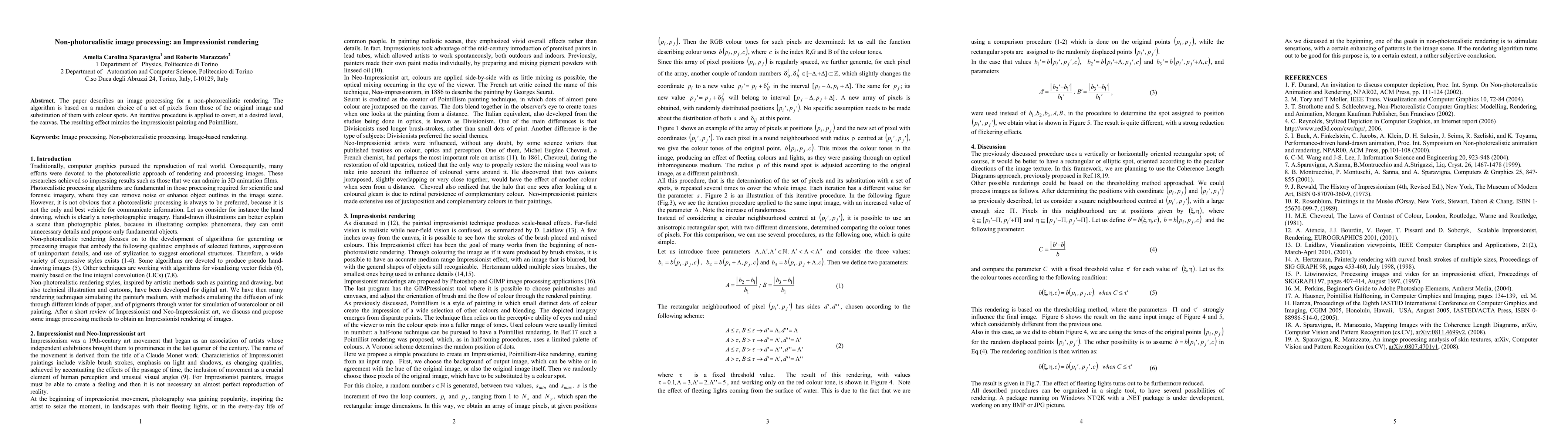This paper presents an algorithm for non-photorealistic rendering that mimics Impressionist and Pointillism styles by randomly selecting pixels from an original image and substituting them with color spots in an iterative process to achieve a desired artistic effect.