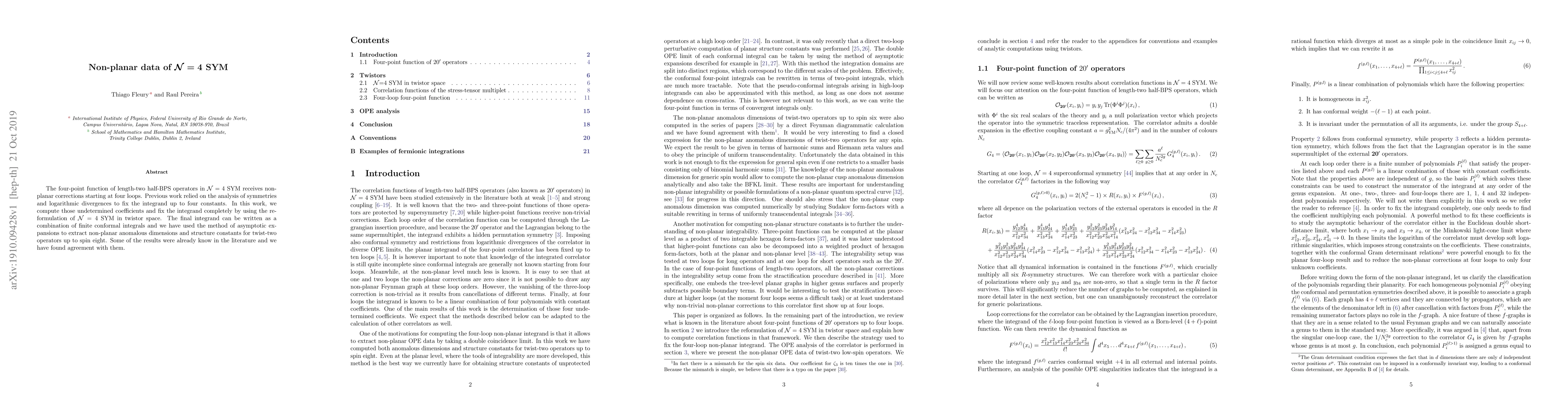 The four-point function of length-two half-BPS operators in $\mathcal{N}=4$ SYM receives non-planar corrections starting at four loops. Previous work relied on the analysis of symmetries and logarithmic divergences to fix the integrand up to four constants. In this work, we compute those undetermined coefficients and fix the integrand completely by using the reformulation of $\mathcal{N}=4$ SYM in twistor space. The final integrand can be written as a combination of finite conformal integrals and we have used the method of asymptotic expansions to extract non-planar anomalous dimensions and structure constants for twist-two operators up to spin eight. Some of the results were already know in the literature and we have found agreement with them.
