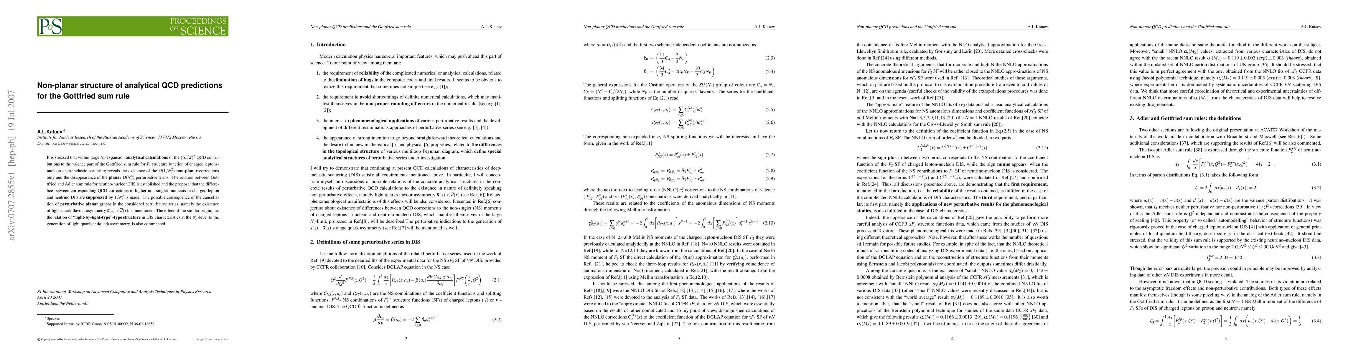 This paper reveals that analytical QCD predictions for the Gottfried sum rule show non-planar corrections at $O(1/N_c^2)$, while planar perturbative terms vanish. It also discusses the suppression of QCD corrections differences in charged-lepton and neutrino deep-inelastic scattering by $1/N_c^2$ and suggests a light-quark flavor asymmetry.