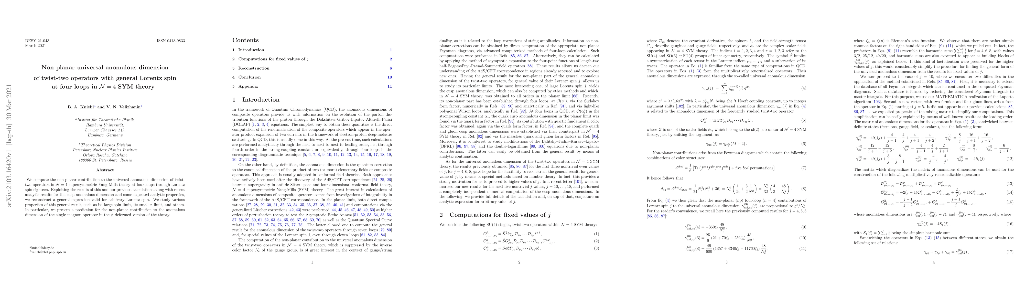 This paper computes the non-planar universal anomalous dimension of twist-two operators in N=4 SYM theory at four loops, focusing on Lorentz spin up to eighteen. The authors reconstruct a general expression for arbitrary Lorentz spin, analyzing its properties and predicting the non-planar contribution to the single-magnon operator in the beta-deformed version of the theory.