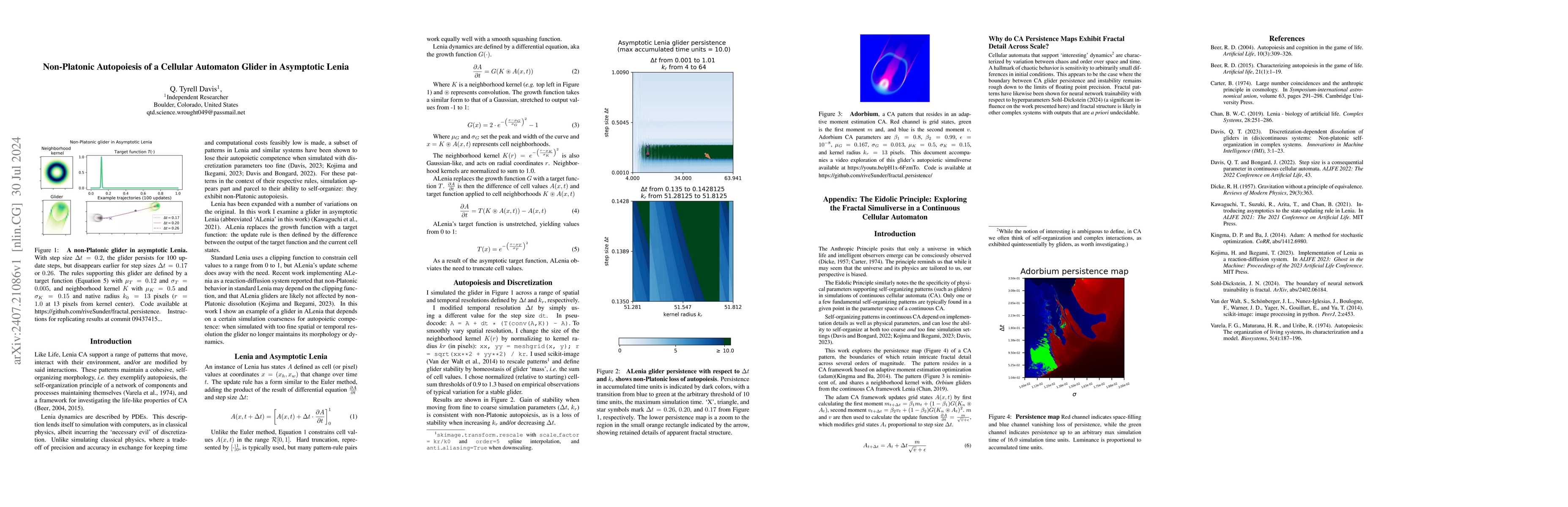 The paper introduces a novel approach to modeling autopoietic behavior in Asymptotic Lenia by examining the dependency of glider persistence on simulation resolution, revealing fractal detail in instability maps.