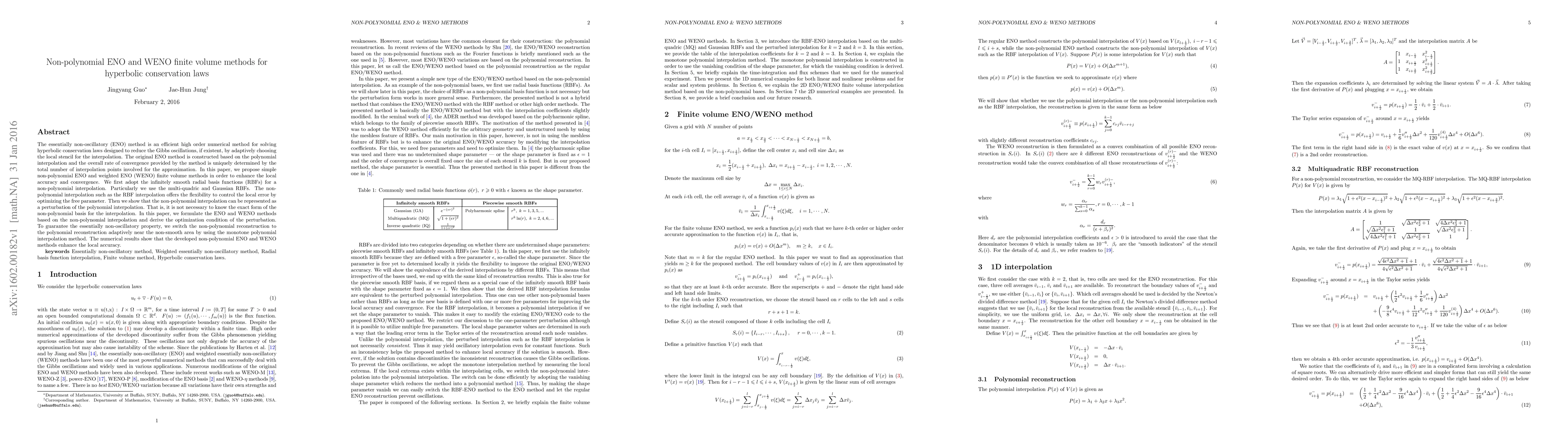 This paper proposes non-polynomial ENO and WENO finite volume methods for hyperbolic conservation laws, utilizing radial basis functions for interpolation to enhance local accuracy and convergence. The methods adaptively switch between non-polynomial and polynomial reconstructions to maintain non-oscillatory properties, demonstrating improved local accuracy in numerical results.