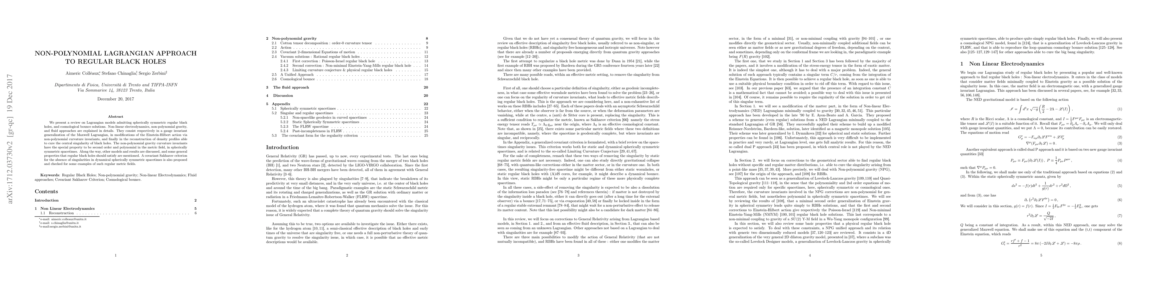We present a review on Lagrangian models admitting spherically symmetric regular black holes, and cosmological bounce solutions. Non-linear electrodynamics, non-polynomial gravity, and fluid approaches are explained in details. They consist respectively in a gauge invariant generalization of the Maxwell Lagrangian, in modifications of the Einstein-Hilbert action via non-polynomial curvature invariants, and finally in the reconstruction of density profiles able to cure the central singularity of black holes. The non-polynomial gravity curvature invariants have the special property to be second order and polynomial in the metric field, in spherically symmetric spacetimes. Along the way, other models and results are discussed, and some general properties that regular black holes should satisfy are mentioned. A covariant Sakharov criterion for the absence of singularities in dynamical spherically symmetric spacetimes is also proposed and checked for some examples of such regular metric fields.