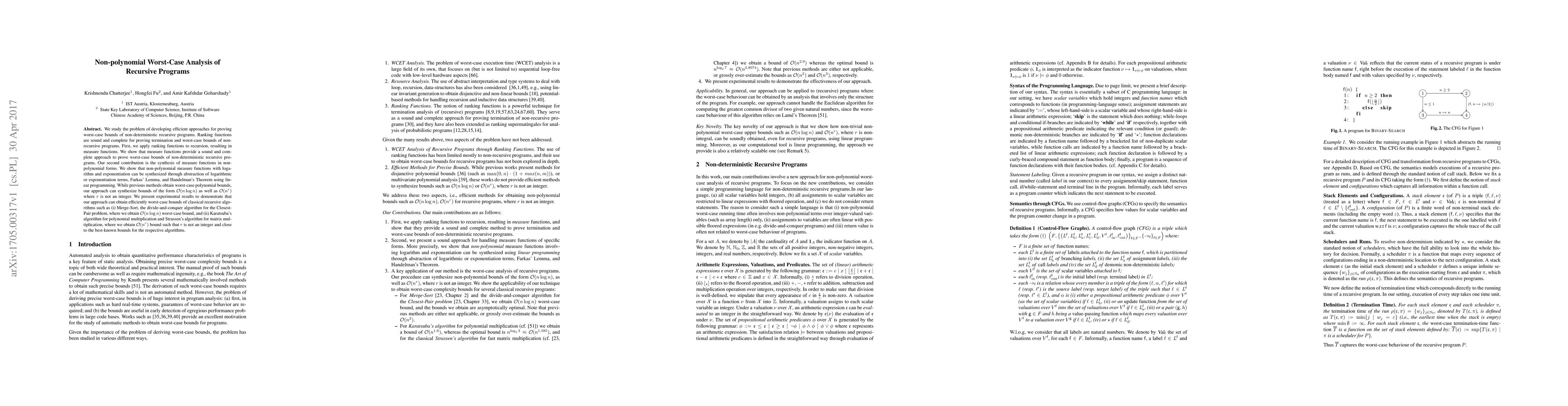 We study the problem of developing efficient approaches for proving worst-case bounds of non-deterministic recursive programs. Ranking functions are sound and complete for proving termination and worst-case bounds of nonrecursive programs. First, we apply ranking functions to recursion, resulting in measure functions. We show that measure functions provide a sound and complete approach to prove worst-case bounds of non-deterministic recursive programs. Our second contribution is the synthesis of measure functions in nonpolynomial forms. We show that non-polynomial measure functions with logarithm and exponentiation can be synthesized through abstraction of logarithmic or exponentiation terms, Farkas' Lemma, and Handelman's Theorem using linear programming. While previous methods obtain worst-case polynomial bounds, our approach can synthesize bounds of the form $\mathcal{O}(n\log n)$ as well as $\mathcal{O}(n^r)$ where $r$ is not an integer. We present experimental results to demonstrate that our approach can obtain efficiently worst-case bounds of classical recursive algorithms such as (i) Merge-Sort, the divide-and-conquer algorithm for the Closest-Pair problem, where we obtain $\mathcal{O}(n \log n)$ worst-case bound, and (ii) Karatsuba's algorithm for polynomial multiplication and Strassen's algorithm for matrix multiplication, where we obtain $\mathcal{O}(n^r)$ bound such that $r$ is not an integer and close to the best-known bounds for the respective algorithms.