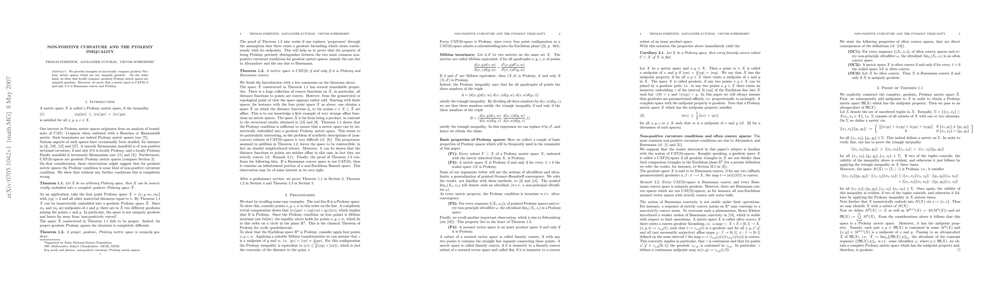We provide examples of non-locally compact geodesic Ptolemy metric spaces which are not uniquely geodesic. On the other hand, we show that locally compact, geodesic Ptolemy metric spaces are uniquely geodesic. Moreover, we prove that a metric space is CAT(0) if and only if it is Busemann convex and Ptolemy.