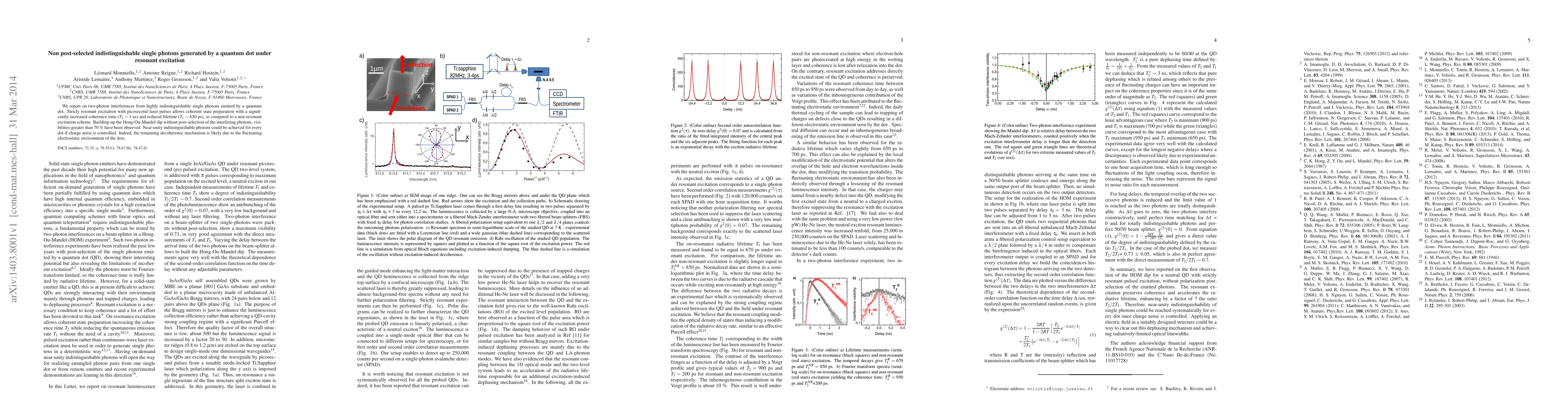 This paper reports on generating highly indistinguishable single photons from a quantum dot under resonant excitation using picosecond laser pulses, achieving coherence times of ~1 ns and reduced lifetimes. The study observes Hong-Ou-Mandel dips with 70% visibility without post-selection, indicating near-unity indistinguishability, though charge noise and fluctuating electrostatic environments pose decoherence challenges.
