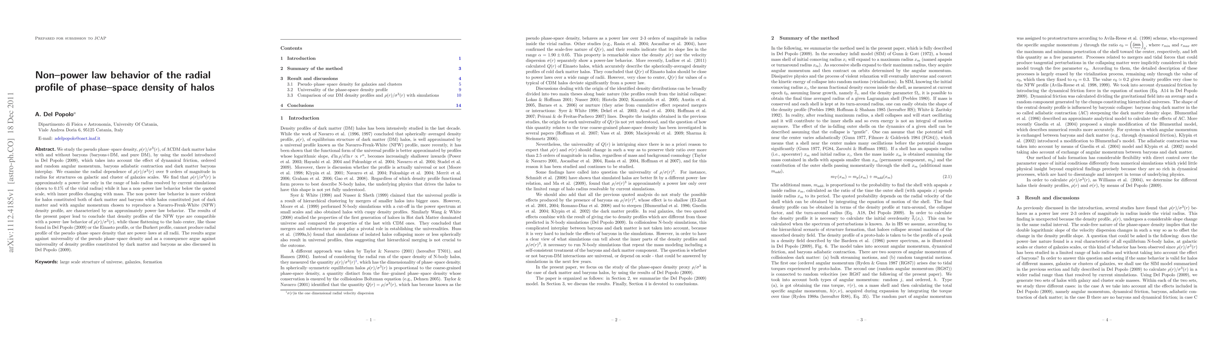 We study the pseudo phase-space density, $\rho(r)/\sigma^3(r)$, of $\Lambda$CDM dark matter halos with and without baryons (baryons+DM, and pure DM), by using the model introduced in Del Popolo (2009), which takes into account the effect of dynamical friction, ordered and random angular momentum, baryons adiabatic contraction and dark matter baryons interplay. We examine the radial dependence of $\rho(r)/\sigma^3(r)$ over 9 orders of magnitude in radius for structures on galactic and cluster of galaxies scales. We find that $\rho(r)/\sigma^3(r)$ is approximately a power-law only in the range of halo radius resolved by current simulations (down to 0.1% of the virial radius) while it has a non-power law behavior below the quoted scale, with inner profiles changing with mass. The non-power-law behavior is more evident for halos constituted both of dark matter and baryons while halos constituted just of dark matter and with angular momentum chosen to reproduce a Navarro-Frenk-White (NFW) density profile, are characterized by an approximately power-law behavior. The results of the present paper lead to conclude that density profiles of the NFW type are compatible with a power-law behavior of $\rho(r)/\sigma^3(r)$, while those flattening to the halo center, like those found in Del Popolo (2009) or the Einasto profile, or the Burkert profile, cannot produce radial profile of the pseudo-phase-space density that are power-laws at all radii. The results argue against universality of the pseudo phase-space density and as a consequence argue against universality of density profiles constituted by dark matter and baryons as also discussed in Del Popolo (2009).