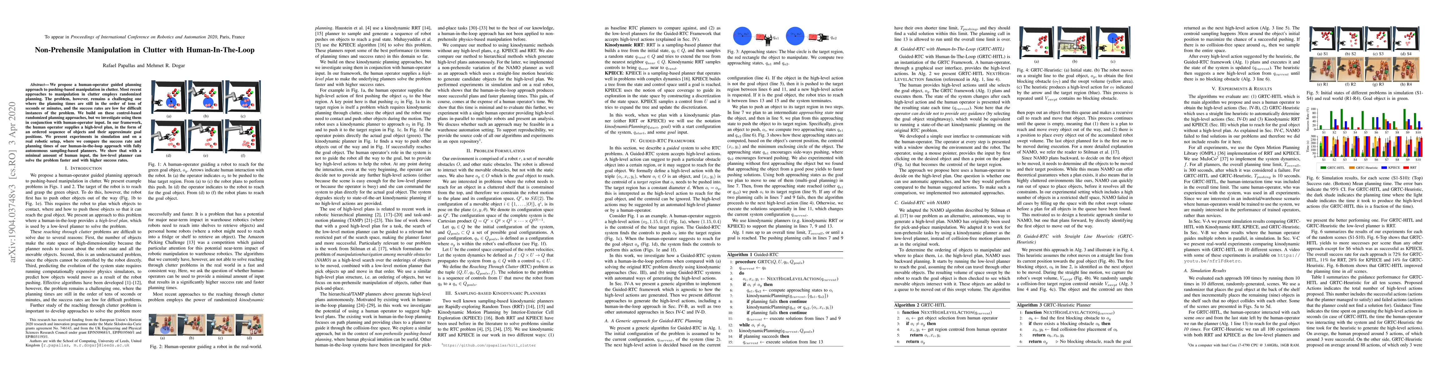 This paper proposes a human-operator guided planning method for pushing-based manipulation in cluttered environments, showing improved success rates and reduced planning times compared to fully autonomous approaches. The human operator provides a high-level plan, which enhances the efficiency of the low-level planner.