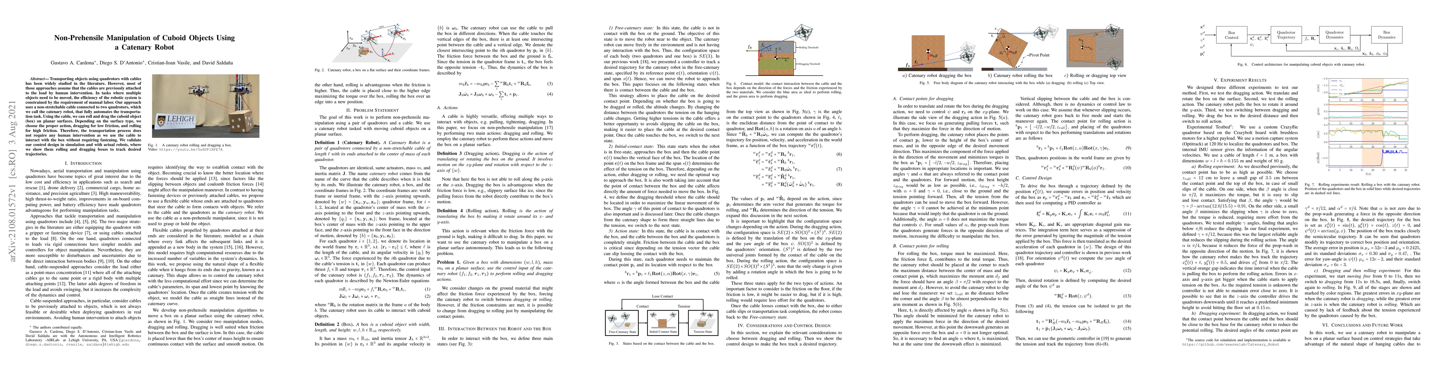 Transporting objects using quadrotors with cables has been widely studied in the literature. However, most of those approaches assume that the cables are previously attached to the load by human intervention. In tasks where multiple objects need to be moved, the efficiency of the robotic system is constrained by the requirement of manual labor. Our approach uses a non-stretchable cable connected to two quadrotors, which we call the catenary robot, that fully automates the transportation task. Using the cable, we can roll and drag the cuboid object (box) on planar surfaces. Depending on the surface type, we choose the proper action, dragging for low friction, and rolling for high friction. Therefore, the transportation process does not require any human intervention as we use the cable to interact with the box without requiring fastening. We validate our control design in simulation and with actual robots, where we show them rolling and dragging boxes to track desired trajectories.
