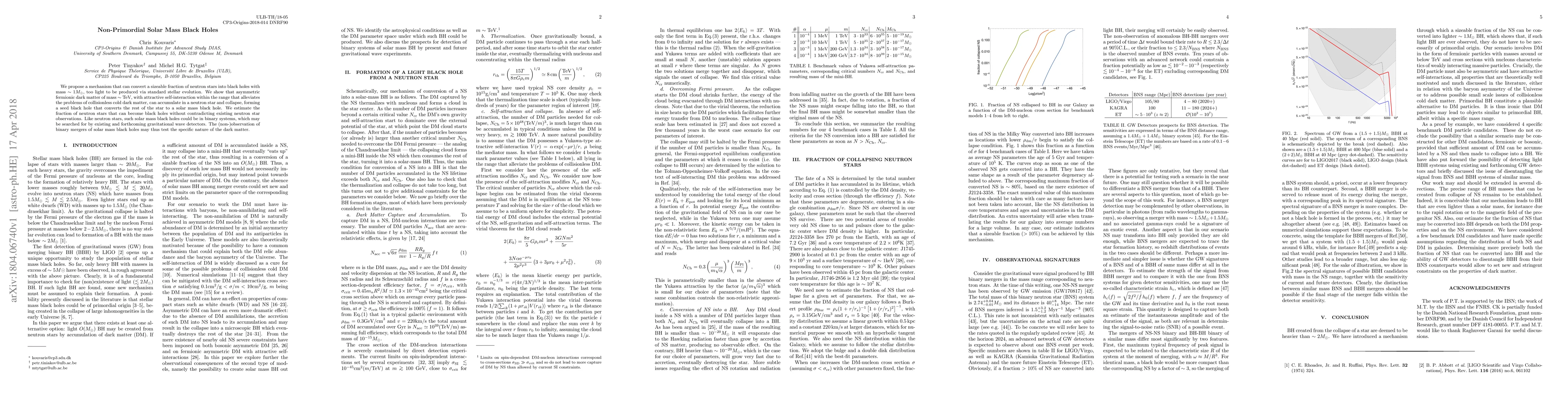 We propose a mechanism that can convert a sizeable fraction of neutron stars into black holes with mass $\sim 1M_\odot$, too light to be produced via standard stellar evolution. We show that asymmetric fermionic dark matter of mass $\sim$ TeV, with attractive self-interaction within the range that alleviates the problems of collisionless cold dark matter, can accumulate in a neutron star and collapse, forming a seed black hole that converts the rest of the star to a solar mass black hole. We estimate the fraction of neutron stars that can become black holes without contradicting existing neutron star observations. Like neutron stars, such solar mass black holes could be in binary systems, which may be searched for by existing and forthcoming gravitational wave detectors. The (non-)observation of binary mergers of solar mass black holes may thus test the specific nature of the dark matter.
