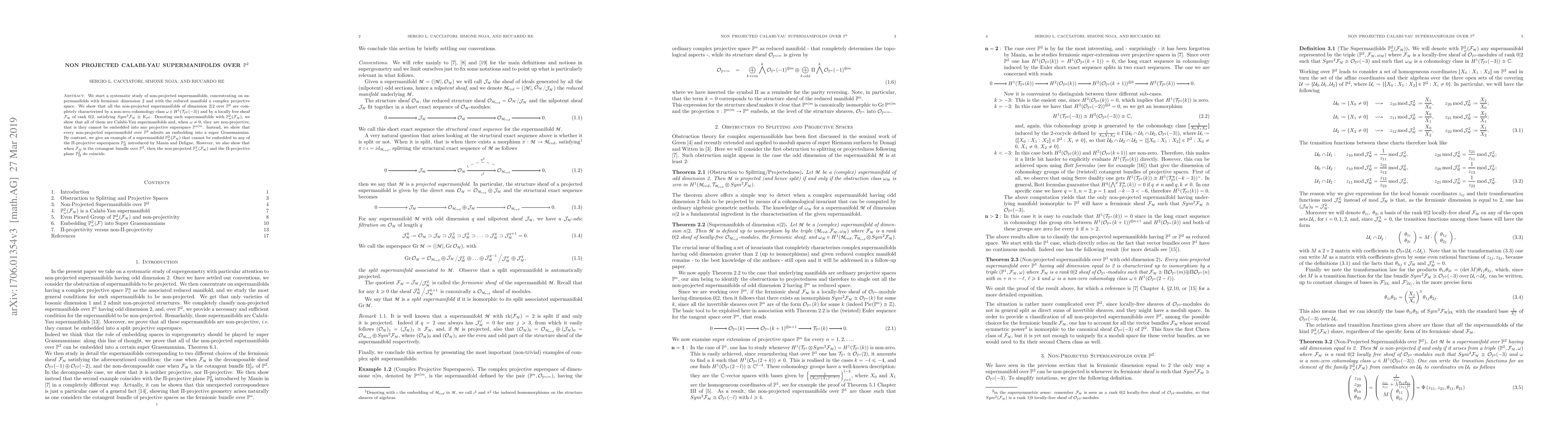 We start a systematic study of non-projected supermanifolds, concentrating on supermanifolds with fermionic dimension 2 and with the reduced manifold a complex projective space. We show that all the non-projected supermanifolds of dimension $2|2$ over $\mathbb{P}^2$ are completely characterised by a non-zero 1-form $\omega$ and by a locally free sheaf $\mathcal{F}$ of rank $0|2$, satisfying $Sym^2 \mathcal{F} \cong K_{\mathbb{P}^2}$. Denoting such supermanifolds with $\mathbb{P}^{2}_\omega(\mathcal{F})$, we show that all of them are Calabi-Yau supermanifolds and, when $\omega \neq 0$, they are non-projective, that is they cannot be embedded into any projective superspace $\mathbb{P}^{n|m}$. Instead, we show that every non-projected supermanifolds over $\mathbb{P}^2$ admits an embedding into a super Grassmannian. By contrast, we give an example of a supermanifold $\mathbb P^{2}_\omega(\mathcal F)$ that cannot be embedded in any of the $\Pi$-projective superspaces $\mathbb P^{n}_{\Pi}$ introduced by Manin and Deligne. However, we also show that when $\mathcal F$ is the cotangent bundle over $\mathbb{P}^2$, then the non-projected $\mathbb{P}^2_\omega(\mathcal F)$ and the $\Pi$-projective plane $\mathbb P^{2}_{\Pi}$ do coincide.