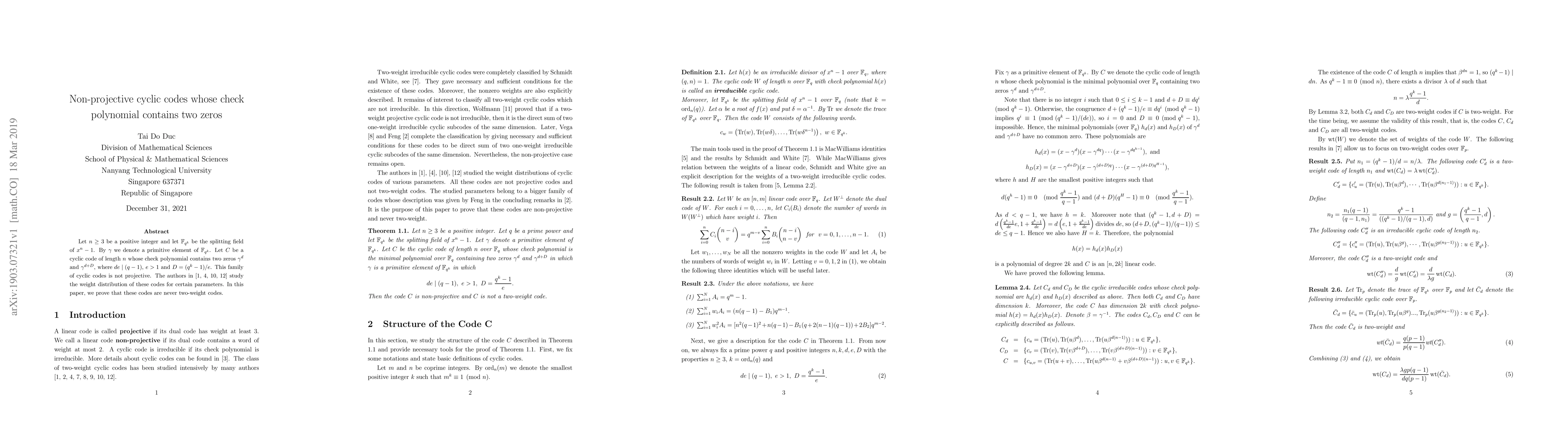 This paper explores non-projective cyclic codes of length $n$ with check polynomial zeros $\gamma^d$ and $\gamma^{d+D}$, proving they are never two-weight codes, which supports Vega's conjecture that all known two-weight cyclic codes are projective.