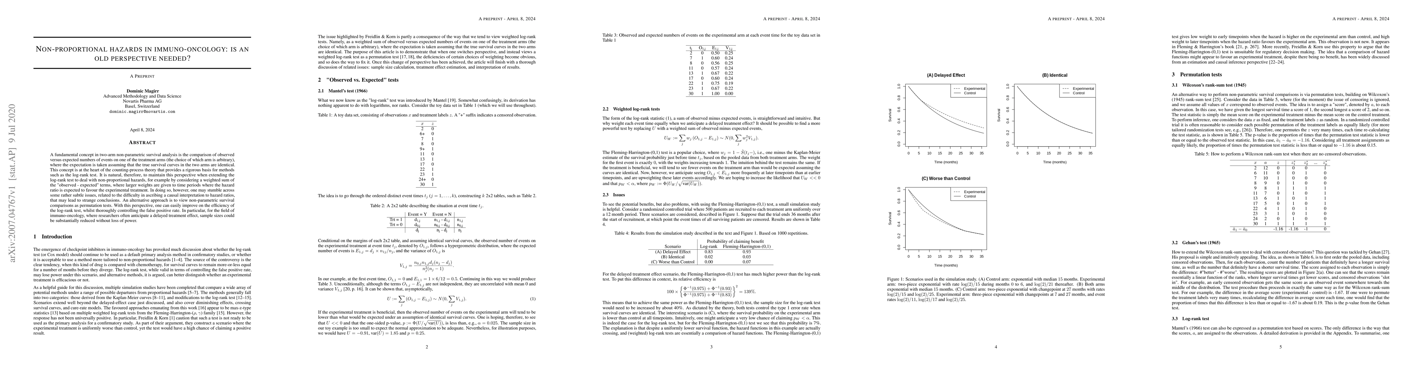 The paper discusses alternative approaches to non-proportional hazards in immuno-oncology, focusing on permutation tests as an improvement over traditional log-rank tests. It explores the Fleming-Harrington (0,1) test and introduces the Modestly-Weighted Log-Rank Test (MWLRT) for delayed treatment effects.