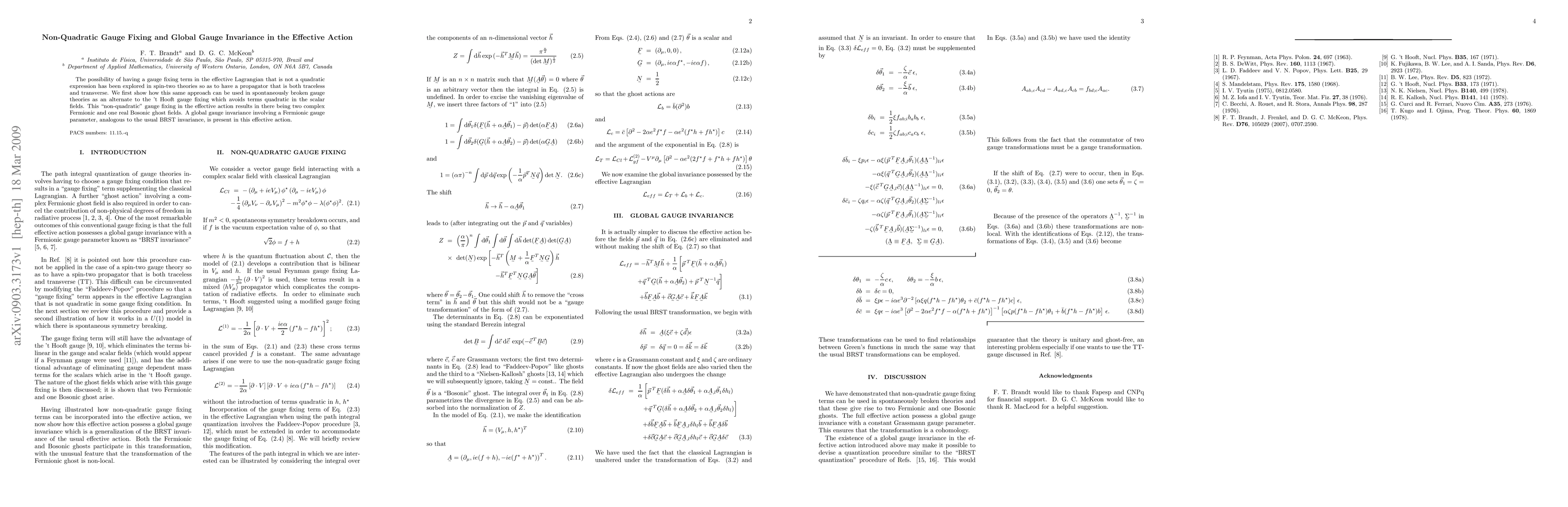 The possibility of having a gauge fixing term in the effective Lagrangian that is not a quadratic expression has been explored in spin-two theories so as to have a propagator that is both traceless and transverse. We first show how this same approach can be used in spontaneously broken gauge theories as an alternate to the 't Hooft gauge fixing which avoids terms quadratic in the scalar fields. This "non-quadratic" gauge fixing in the effective action results in there being two complex Fermionic and one real Bosonic ghost fields. A global gauge invariance involving a Fermionic gauge parameter, analogous to the usual BRST invariance, is present in this effective action.