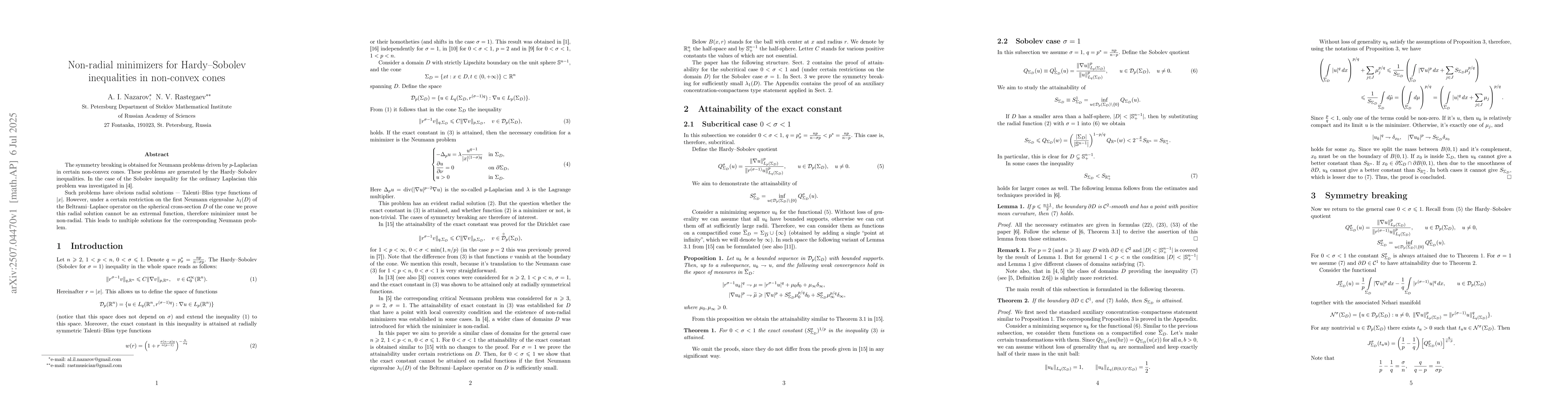 The symmetry breaking is obtained for Neumann problems driven by $p$-Laplacian in certain non-convex cones. These problems are generated by the Hardy--Sobolev inequalities. In the case of the Sobolev inequality for the ordinary Laplacian this problem was investigated in (Ciraolo, Pacella, Polvara, 2024). Such problems have obvious radial solutions -- Talenti--Bliss type functions of $|x|$. However, under a certain restriction on the first Neumann eigenvalue $\lambda_1(D)$ of the Beltrami--Laplace operator on the spherical cross-section $D$ of the cone we prove this radial solution cannot be an extremal function, therefore minimizer must be non-radial. This leads to multiple solutions for the corresponding Neumann problem.