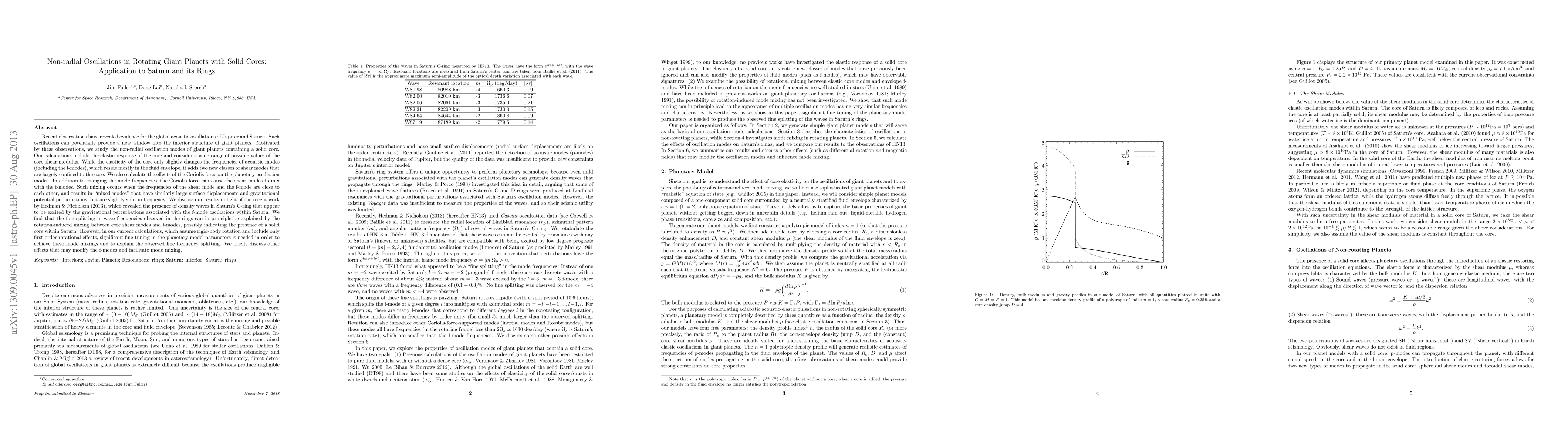 Recent observations have revealed evidence for the global oscillations of Jupiter and Saturn, which can potentially provide a new window into the interior structure of giant planets. Motivated by these observations, we study the non-radial oscillation modes of giant planets containing a solid core. Our calculations include the elastic response of the core and consider a wide range of possible values of the core shear modulus. While the elasticity of the core only slightly changes the frequencies of acoustic modes, which reside mostly in the fluid envelope, it adds two new classes of shear modes that are largely confined to the core. We also calculate the effects of the Coriolis force on the planetary oscillation modes. In addition to changing the mode frequencies, the Coriolis force can cause the shear modes to mix with the f-modes. Such mixing occurs when the frequencies of the shear mode and the f-mode are close to each other, and results in "mixed modes" with similar properties that are slightly split in frequency. We discuss our results in light of the recent work by Hedman & Nicholson (2013), which revealed the presence of density waves in Saturn's C-ring that appear to be excited by the gravitational perturbations associated with the f-mode oscillations within Saturn. We find that the fine splitting in wave frequencies observed in the rings can in principle be explained by the rotation-induced mixing between core shear modes and f-modes, possibly indicating the presence of a solid core within Saturn. However, in our current calculations, which assume rigid-body rotation and include only first-order rotational effects, significant fine-tuning in the planetary model parameters is needed in order to achieve these mode mixings and to explain the observed fine frequency splitting. We briefly discuss other effects that may modify the f-modes and facilitate mode mixing.