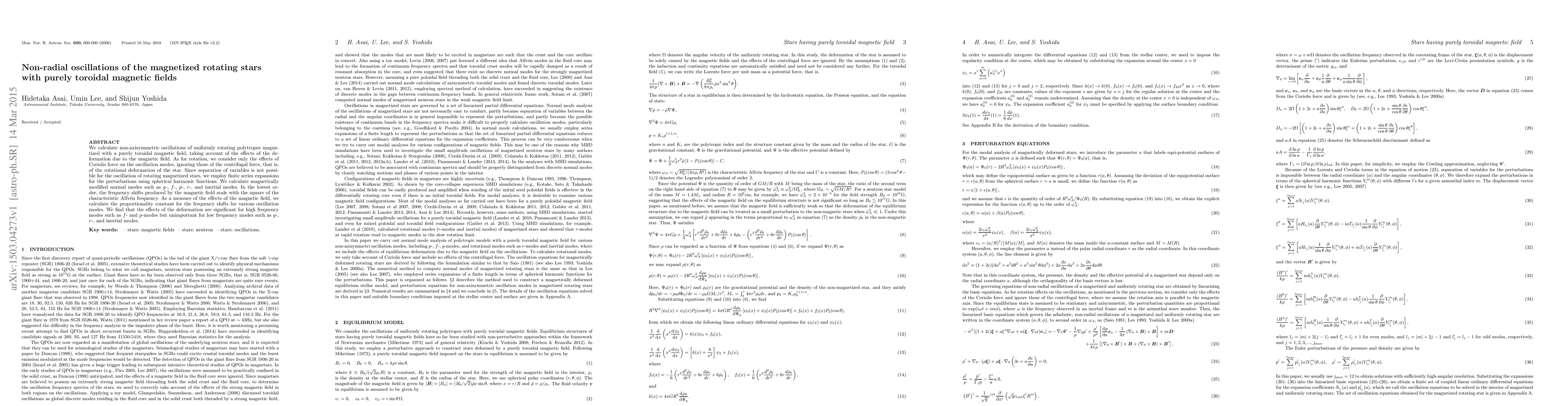 The study calculates non-axisymmetric oscillations of uniformly rotating polytropes magnetized with purely toroidal magnetic fields, considering the effects of the Coriolis force on oscillation modes but ignoring centrifugal force effects.