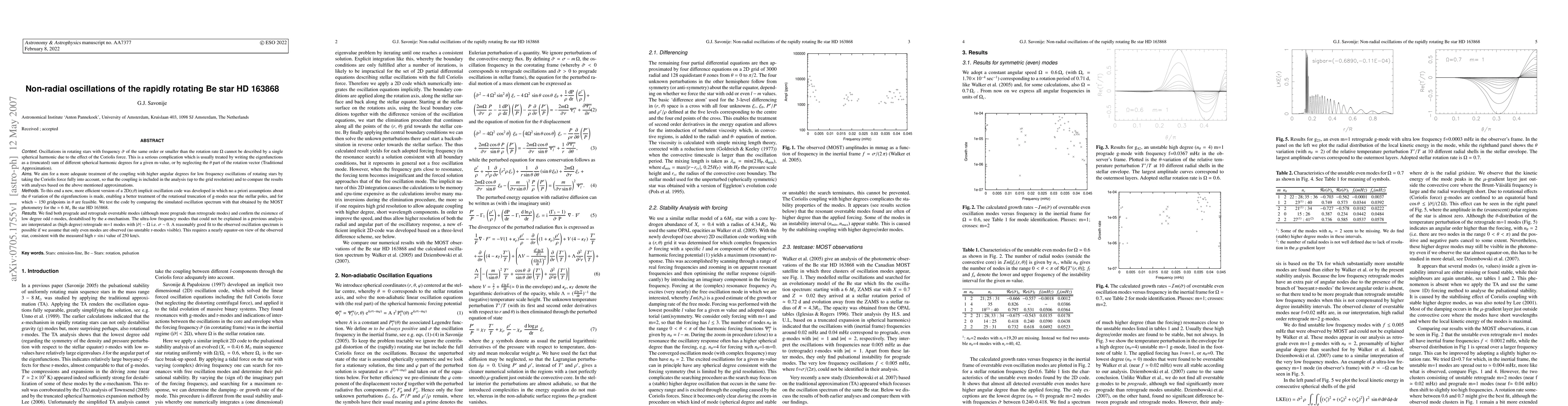 The research analyzes the pulsational stability of the rapidly rotating Be star HD 163868 using a 2D oscillation code accounting for the Coriolis force. Findings include both prograde and retrograde overstable modes, confirmation of low-degree odd r-modes destabilized by the kappa-mechanism, and interpretation of ultra-low frequency modes as high-degree, retrograde m=1 modes. A good fit to the observed spectrum is achieved by assuming only even modes are observed, supported by the star's high v sin i value suggesting an nearly equator-on view.
