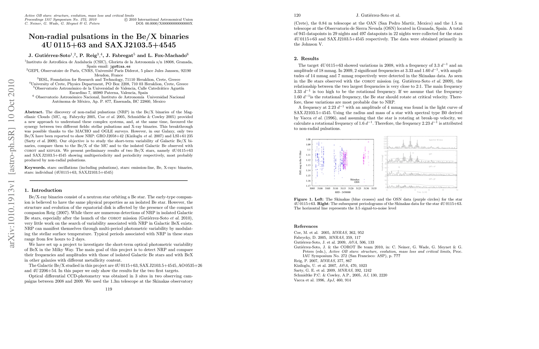The discovery of non-radial pulsations (NRP) in the Be/X binaries of the Magellanic Clouds (MC, eg. Fabrycky 2005, Coe et al. 2005, Schmidtke & Cowley 2005) provided a new approach to understand these complex systems, and, at the same time, favoured the synergy between two different fields: stellar pulsations and X-ray binaries. This breakthrough was possible thanks to the MACHO and OGLE surveys. However, in our Galaxy, only two Be/X have been reported to show NRP: GROJ2058+42 (Kiziloglu et al. 2007) and LSI+61 235 (Sarty et al. 2009). Our objective is to study the short-term variability of Galactic Be/X binaries, compare them to the Be/X of the MC and to the isolated Galactic Be observed with CoRoT and Kepler. We present preliminary results of two Be/X stars, namely 4U0115+63 and SAXJ2103.5+4545 showing multiperiodicity and periodicity respectively, most probably produced by non-radial pulsations.