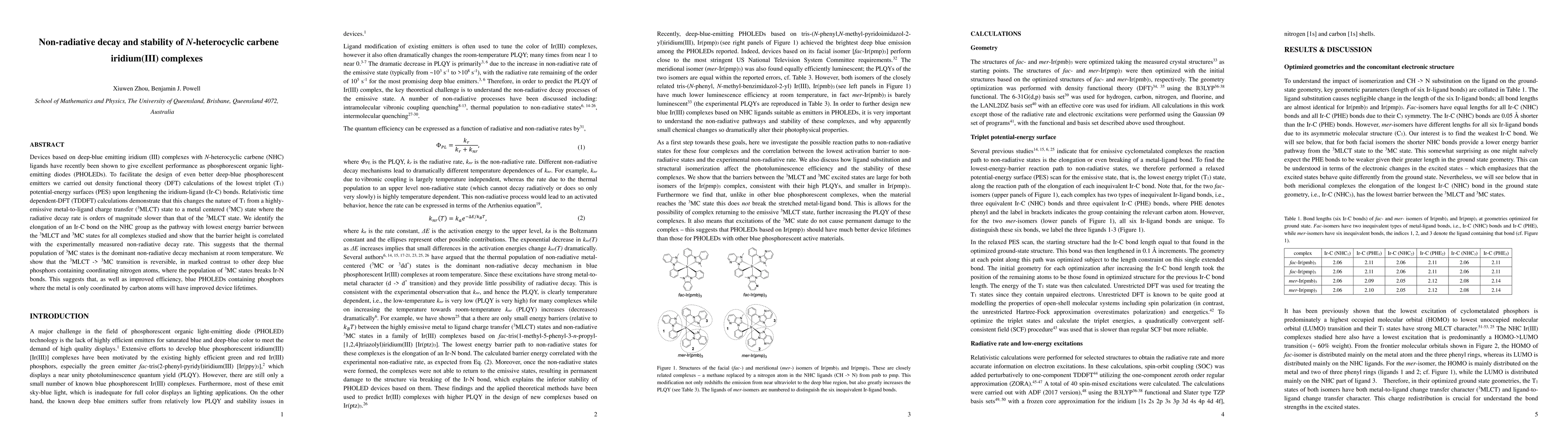 Devices based on deep-blue emitting iridium (III) complexes with N-heterocyclic carbene (NHC) ligands have recently been shown to give excellent performance as phosphorescent organic light-emitting diodes (PHOLEDs). To facilitate the design of even better deep-blue phosphorescent emitters we carried out density functional theory (DFT) calculations of the lowest triplet ($T_1$) potential-energy surfaces (PES) upon lengthening the iridium-ligand (Ir-C) bonds. Relativistic time dependent-DFT (TDDFT) calculations demonstrate that this changes the nature of $T_1$ from a highly-emissive metal-to-ligand charge transfer ($^3$MLCT) state to a metal centered ($^3$MC) state where the radiative decay rate is orders of magnitude slower than that of the $^3$MLCT state. We identify the elongation of an Ir-C bond on the NHC group as the pathway with lowest energy barrier between the $^3$MLCT and $^3$MC states for all complexes studied and show that the barrier height is correlated with the experimentally measured non-radiative decay rate. This suggests that the thermal population of $^3$MC states is the dominant non-radiative decay mechanism at room temperature. We show that the $^3$MLCT $\rightarrow$ $^3$MC transition is reversible, in marked contrast to other deep blue phosphors containing coordinating nitrogen atoms, where the population of $^3$MC states breaks Ir-N bonds. This suggests that, as well as improved efficiency, blue PHOLEDs containing phosphors where the metal is only coordinated by carbon atoms will have improved device lifetimes.