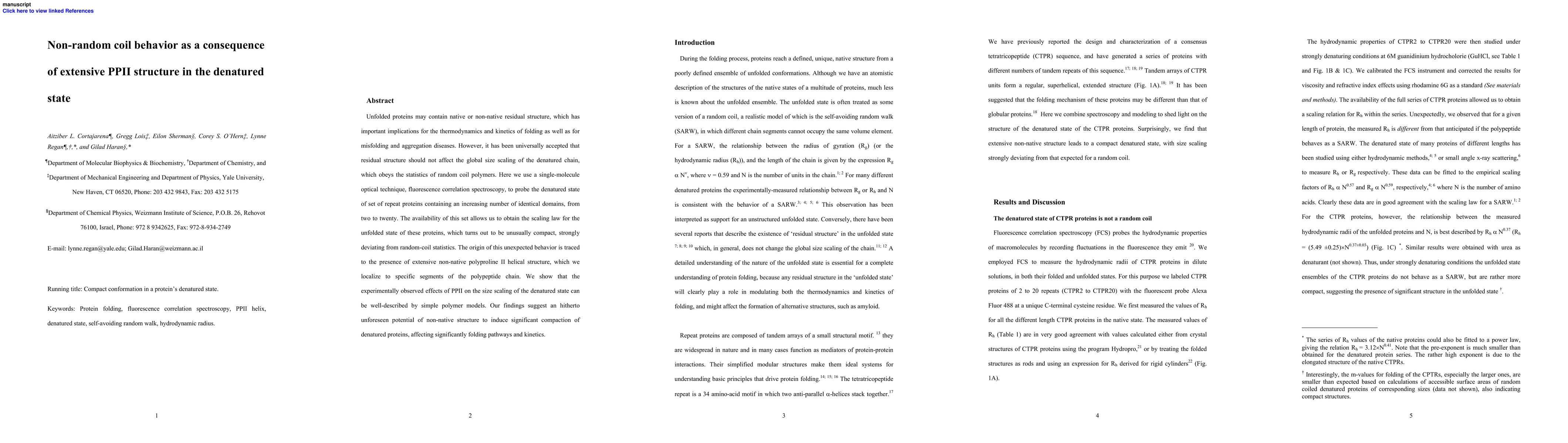 This study reveals that denatured proteins exhibit non-random coil behavior due to extensive polyproline II (PPII) helical structure, deviating from the expected random-coil scaling. The findings suggest that such non-native structures can significantly impact the folding pathways and kinetics of proteins.