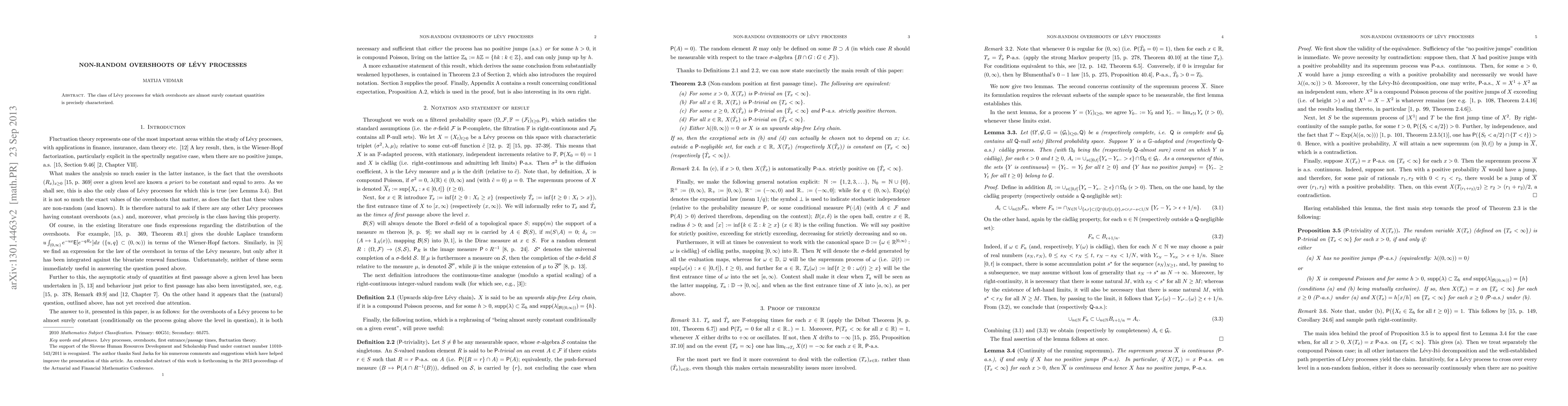 The class of Levy processes for which overshoots are almost surely constant quantities is precisely characterized.